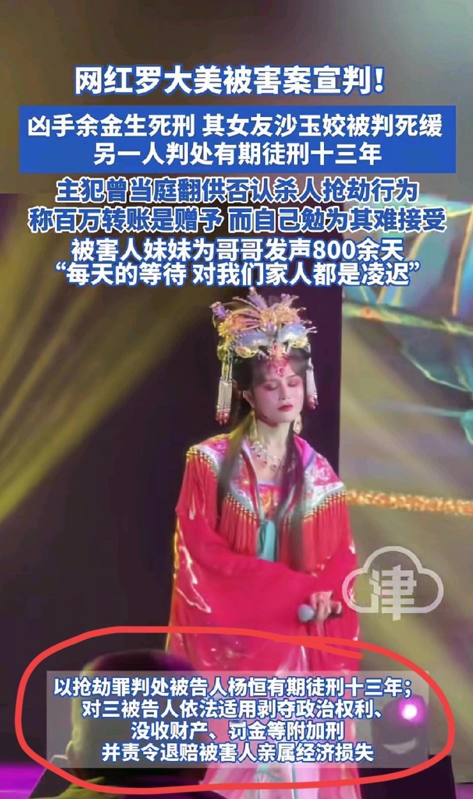 罗大美案尘埃落定!余金生,但愿能吃上花生米,沙玉娇尚缓两年,杨恒13年。 这个案子比较典型,它可以警醒世人,低调做人,不要轻易相信别人,善良也要有度,远离小人。 斯人已逝,虽然对尚家的伤害不可逆,还是希望尚家小妹能跳出哥哥意外去世的影响,以后扔掉“包袱”,过自己的生活。 她为哥哥,已经做得很多了。 而那个与尚小妹年龄相仿的沙玉娇,00后案犯,缓刑两年也是要顶着巨大压力过得,这是对她行不义事的惩罚。