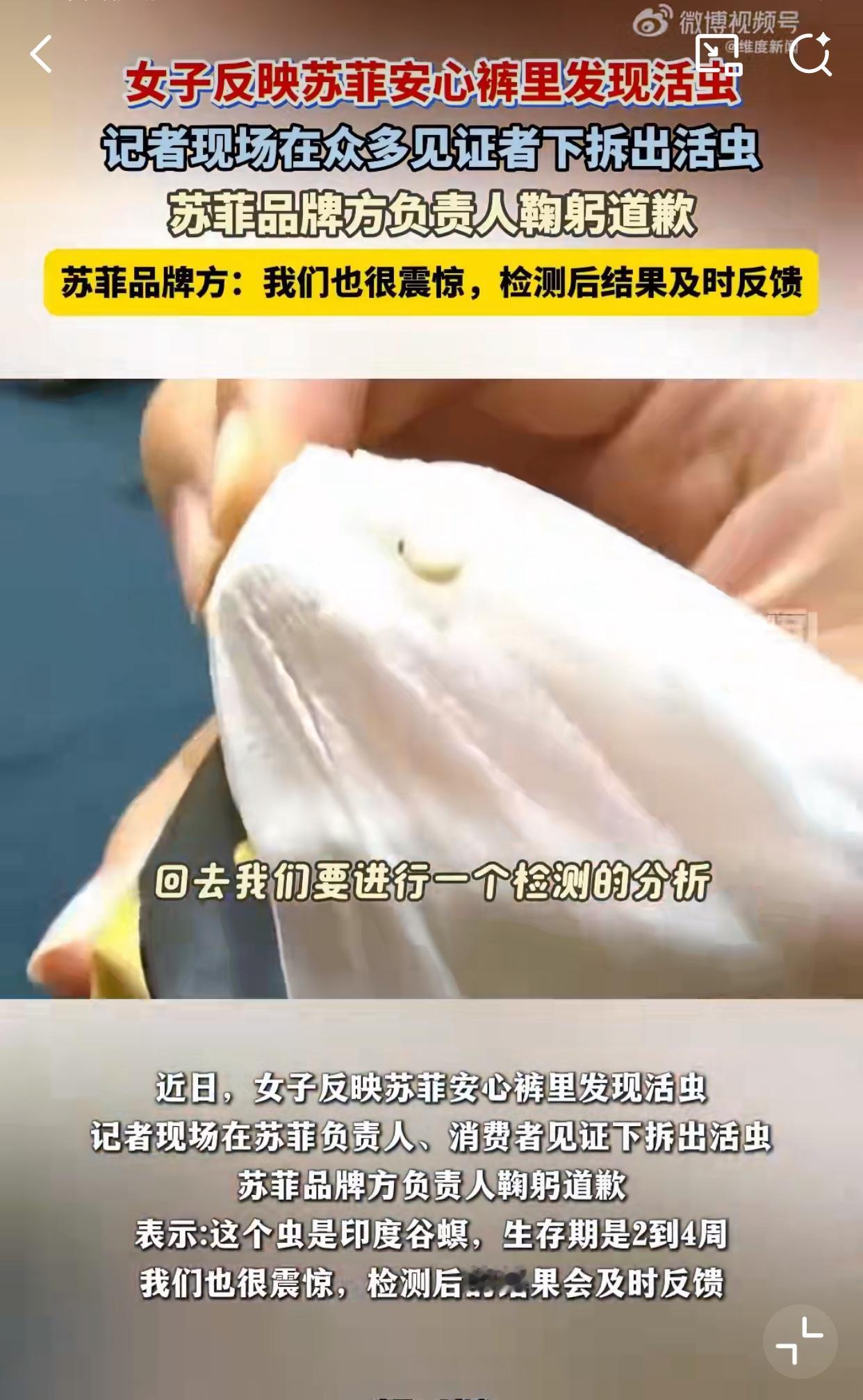 安心裤惊现活虫! 一开始还以为是个例或者是假的! 但如今是真的! 郑州霍女士给13岁女儿买了安心裤,女儿在使用过程中发现里面有活虫在蠕动,事后品牌方在媒体的见证下,随机拆封同批次的产品时,再次发现活虫,品牌方当场鞠躬道歉! 郑女士带女儿去医院检查后,女儿霉菌感染!(暂不确定是否与这次事件有关) 此次事件的安心裤是今年5月30日生产的,建议大家在使用时仔细看看,如果发现问题,暂停使用及时维权! 希望品牌方好好彻查,给消费者一个满意的交代,别再让类似的事情再发生,女性的健康不是小事!
