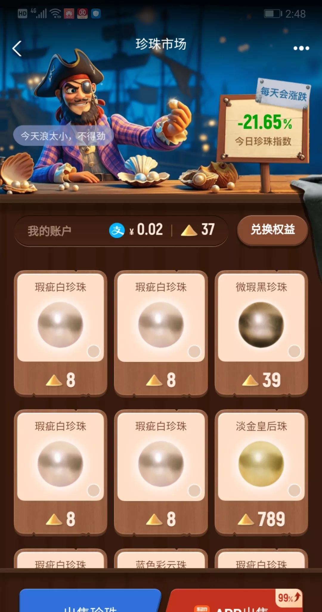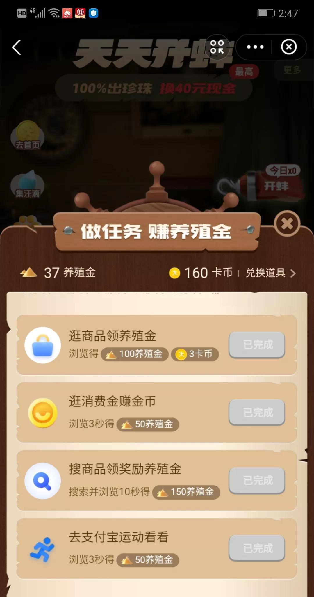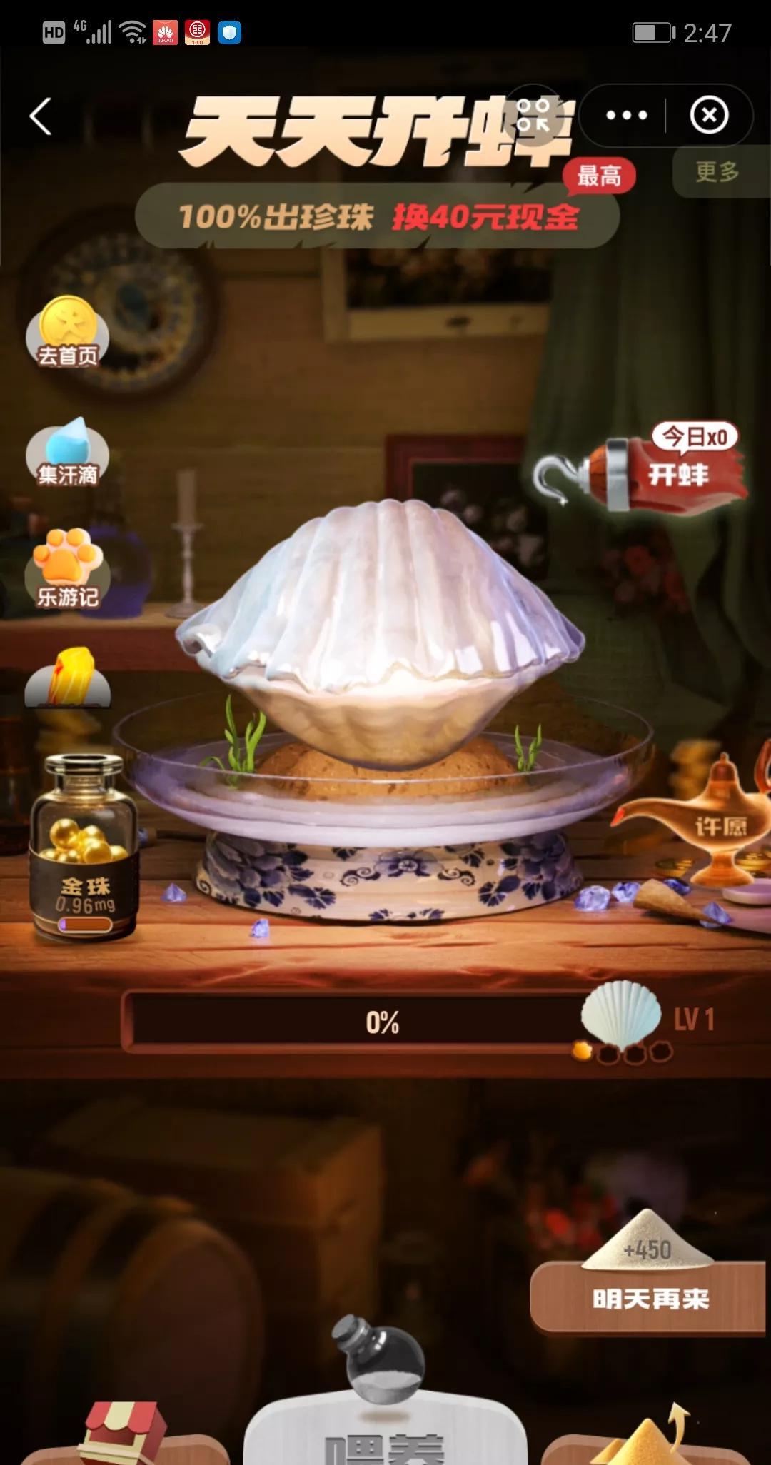 天天开蚌 每天看广告,完成任务,得到养殖金。喂养,开蚌,每天两次机会,开出某种珠,出售,再得养殖金,循环往复。 偶尔开出现金,几分钱。 也开出过金珠0.01克,猴年马月才能凑够啊。 想放弃了。