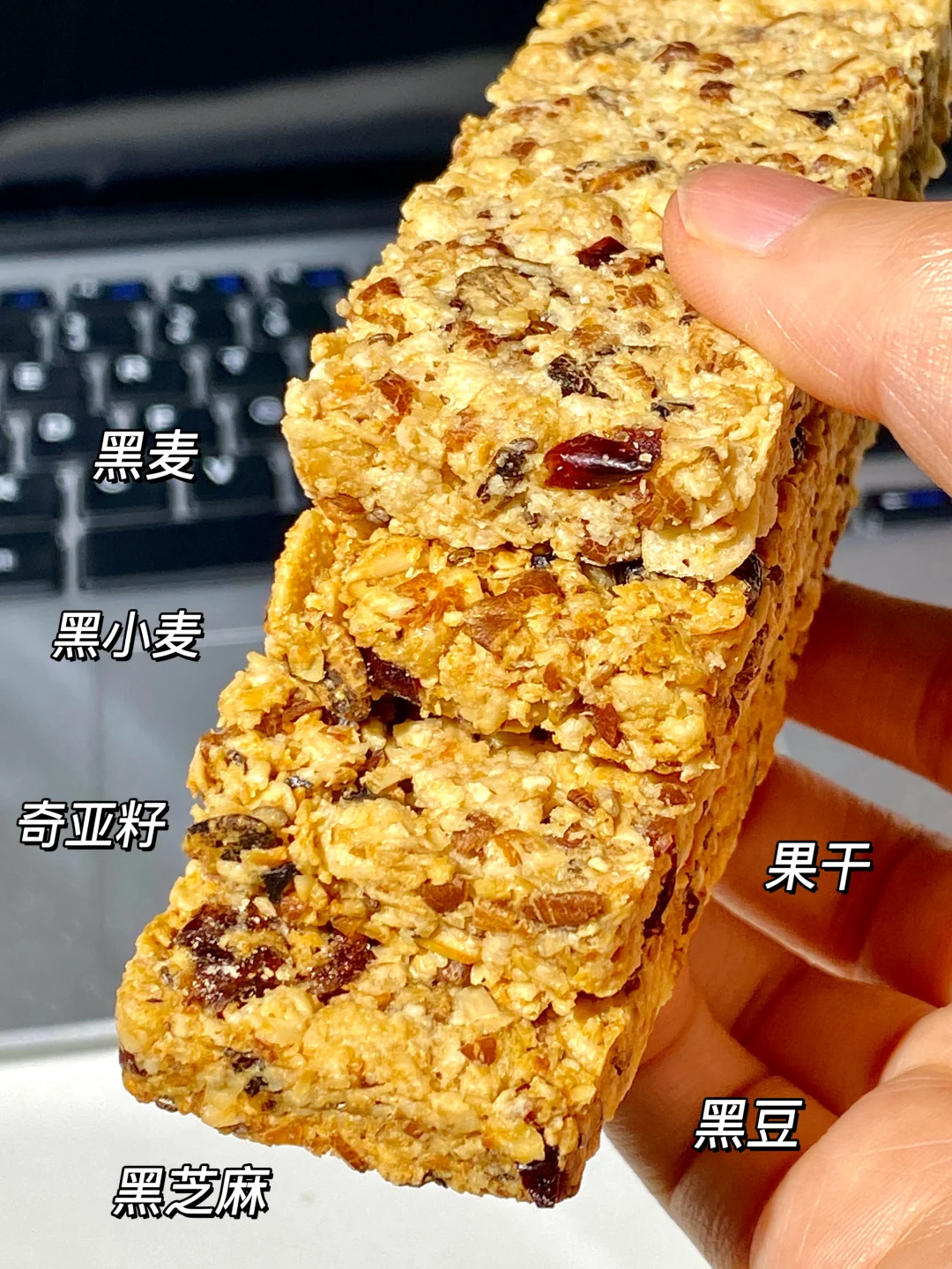 肉眼可见5种黑色食材,黑麦,黑小麦,奇亚籽,黑芝麻,黑豆,还有果干,一根就能get五重营养✌️