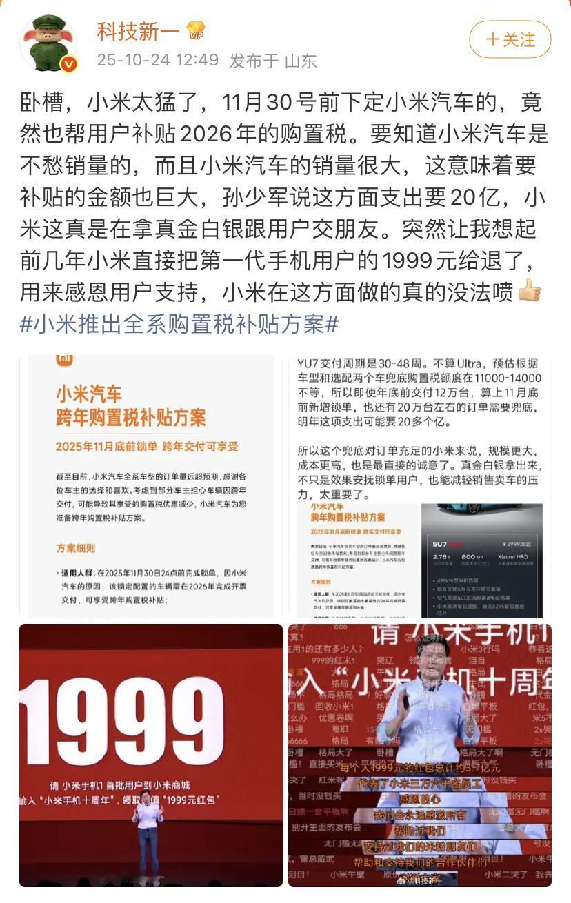 小米也太猛了,额外支出20亿也要把订单拿下!小米全部为客户承担1.5万元的购置税! 其他家承担购置税的时候没有上热搜,但是小米承担购置税的时候确实上了热搜,对于小米的粉丝小米的客户来说,这真的是一个非常好的消息。 同时也证明了汽车行业竞争已经进入了新的阶段,不单单是抢订单,现在还要额外掏钱为客户付购置税了。 不知道燃油车有没有这项策略,要是燃油车也有这样策略的话,那么燃油车的销量也可能会因此起飞。