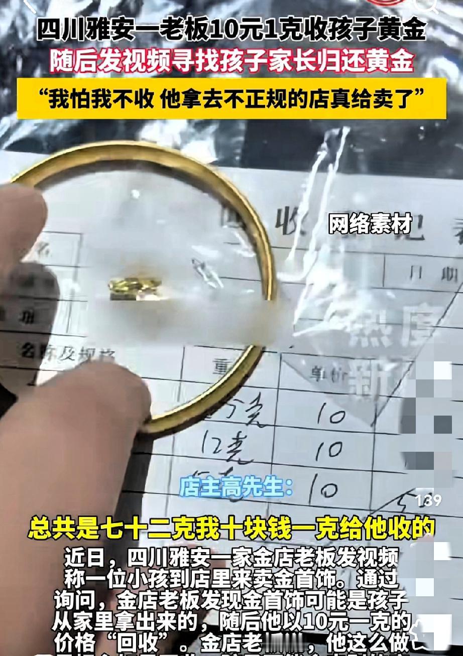 72克黄金只给720块? 四川这金店老板不是坑人,是真高明!明知市价能卖七万多,见孩子来卖金饰,当场就觉出不对劲,干脆用10元一克的“象征性价格”把金子留下。 他这哪是回收,分明是“临时保管”。怕直接拒绝,孩子不懂价,转头被黑作坊骗走,那家人的损失就彻底找不回来了。收完立马拍视频、发业主群找家长,俩小时就把金子完璧归赵。 老板做事讲良心、受本心,没有糊弄孩子赚这黑心钱。比起死守规矩不管不顾,这种“多管闲事”才守住了生意人的良心。为老板点个赞! 足金金饰价格 黄金金店价格 金饰价 黄金超十万 黄金一克黄 银行黄金回收标准是什么?