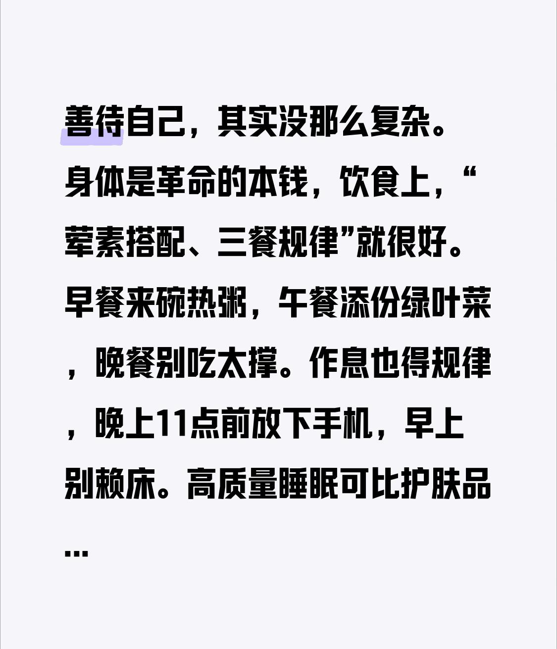 善待自己,其实没那么复杂。 身体是革命的本钱,饮食上,“荤素搭配、三餐规律”就很好。早餐来碗热粥,午餐添份绿叶菜,晚餐别吃太撑。作息也得规律,晚上11点前放下手机,早上别赖床。高质量睡眠可比护肤品管用多了。 精神上,要遵循内心的热情,别被外界声音左右。多和朋友聚聚,亲密关系是幸福捷径。正确看待失败,别让恐惧阻碍尝试新事物。生活还得简化,求精不求多。始终保持感激之心,别把家人、健康等当成理所当然。人生不过三万天,从日常点滴善待自己吧。