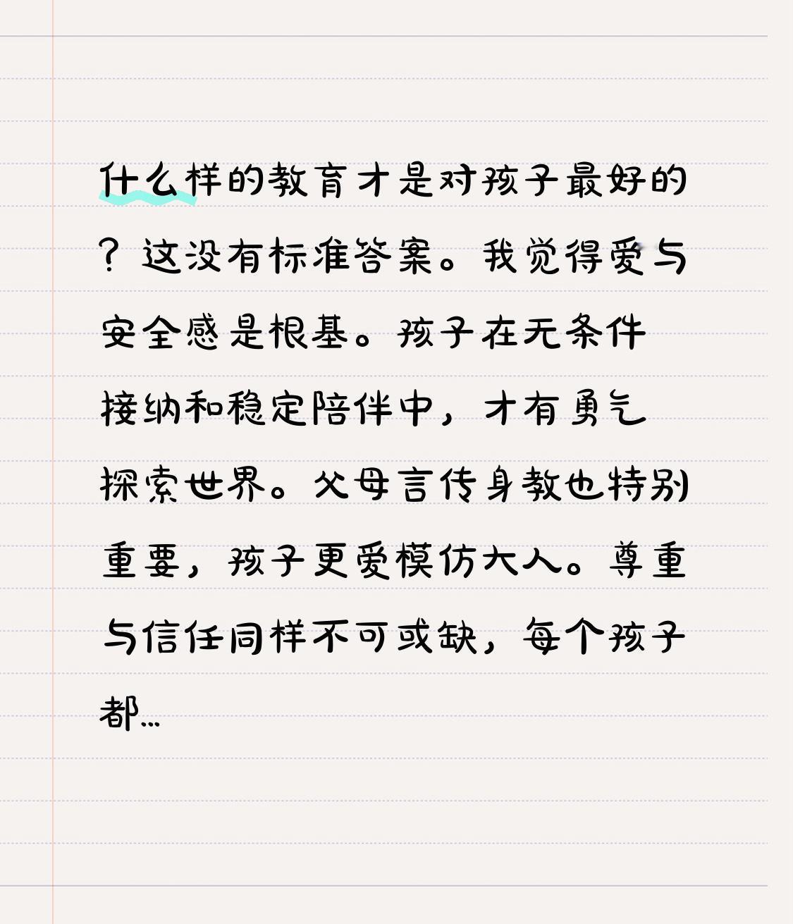 什么样的教育才是对孩子最好的?这没有标准答案。 我觉得爱与安全感是根基。孩子在无条件接纳和稳定陪伴中,才有勇气探索世界。父母言传身教也特别重要,孩子更爱模仿大人。尊重与信任同样不可或缺,每个孩子都是独特的,尊重差异、信任潜力才能让他们自信成长。 培养健全人格是目标,独立性、责任感等品格比成绩更能应对未来。智慧引导是方法,设定底线、提供资源让孩子自由探索。普通父母给予孩子无条件的爱,用耐心和包容陪伴,孩子自会向阳而生。