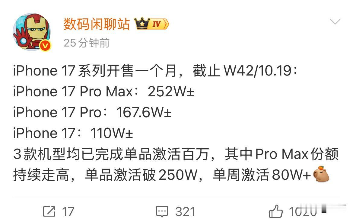 数码闲聊站: iPhone 17开售一个月成绩来了:三款机型的单品激活量都已经超过百万! 就在刚才,数码闲聊站放出了最新的数据,截止到10月19号,苹果手机的最新激活量来了,卖得最好的,反而是那个最贵的iPhone 17 Pro Max它的激活量达到了惊人的252万台[捂脸],要知道这玩意儿一万多块钱一台,现在可以确定有252万人买了这个手机[捂脸] 另外iPhone 17 Pro 版本的激活量已达到了167.6万台,可能体验过这三台机子的人有一种感觉,那就是这台手机,他其实拿在手上还是比较沉的,反而是iPhone 17 Pro Max版本手上的手感要轻一些,因为它整体的面积大一些,其实重量差不多,但也居然有1,67万多人选择了这台手机,可想而知他们的影响力真的不是吹的! 即便是刚好入门版的iPhone 17 ,到10月19号的激活量也超过了110万台,也就是说在三台手机全部的激活量都超过了百万台,最牛的那一台超过了两百多万台! 没办法,这么多年了,苹果生态做得太硬了,所以是不是可以反过来说明,我们国产手机的机会还比较多,因为这个市场格足够大,只要我们国产手机能够把生态做好,比如华为的手机能够把鸿蒙系统得越来越完善,影响越来越多的用户,说不定到一个程度之后,某一天这些苹果用户就会慢慢地转过来! 或者小米的生态做得越来越好,迟到也有这一天,但是不管怎么样,现在手机之间的硬件区别真的不大了,限制我们国产很多手机的硬件早就超过苹果手机了,但是为什么还是选择他,根本原因还是在于他们的生态。 但是这个东西它的建立,并非几年时间可以搞定,而且苹果自己的生态也在不断地升级,所以想要把这几百上千万的用户吸引过来,真的要靠真本事才行。 因此,与其羡慕,还不如承认真正的差距,这样才能够看到对手的强大,一点一点的赶上他并且超越他。 你觉得这一天的到来,需要多少年?