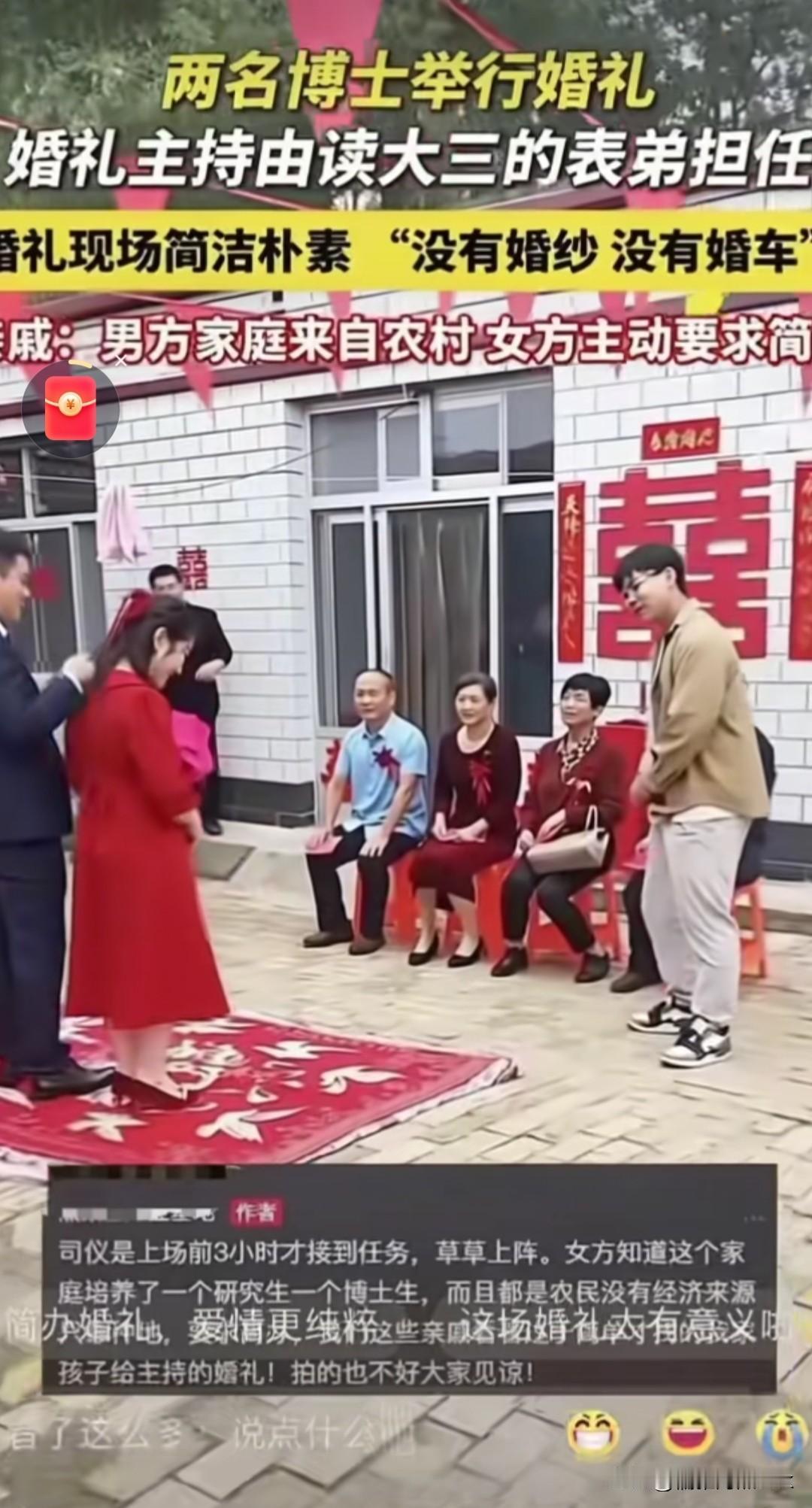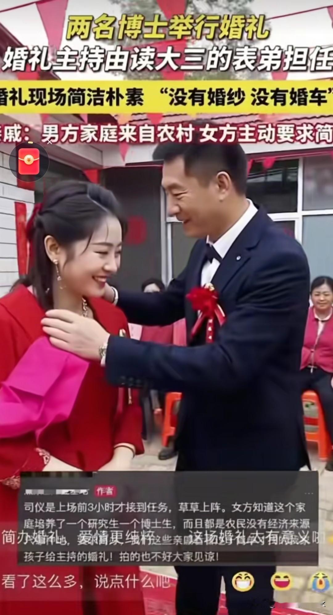 当今清流!一个大学生给两个博士生主持婚礼,婚礼简洁朴素,喜庆毫不打折,一对新人脸上乐开了花。 把钱花在刀刃上。河北这对新人的婚礼如一股清流,别具一格。没有张灯结彩的婚庆台,只有墙壁上贴着一张大大的喜字,家庭小院就是婚礼现场。没有邀过多亲朋,只有双方至亲。连司仪都是免费的读大三的表弟,在婚礼前三小时才接到任务,草草上台,生涩又有文采的祝福引来阵阵爽朗的笑声。 新娘笑得眉眼弯弯,像盛了半盏星光。新郎满脸疼爱,轻轻为娘子拂顺吹松的头发,相视而笑娇羞又温柔。双方父母高堂坐,“爸爸”“妈妈”叫得响亮,发自内心的感恩。 男方父母都是农民,靠种田培养了一个博士生和一个硕士生,非常了不起和不容易。 女方是湖南人,挺理解男方,主动要求简朴,没有婚纱,婚车,不搞花里胡哨的面子工程,将父母来之不易的每一分钱花在实处。 所以说,娶对了人根本没有压力,没有焦虑,这一下子就可以节省好几万,拿来过日子不香吗? 但更多的女人认为,别人有的我也得有,而且必须办得更奢侈才代表重视。 其实,婚礼上很多的面子工程只新娘一人在乎,其他参加婚礼的都觉像玩提线木偶,千篇一律又烧钱,根本代表不了什么。 前面为钱𠲜得面红耳赤,后面台上的山盟海誓喊得再响亮,也不影响吵闹分手,还不如来点实的,解决些实际困难。 大家发现吗?当学识达到一定高度后,世俗就会变得一文不值。越是文化低的穷的越是互相为难。世人最羡慕的是夫唱妇随,将日子过得稳当,温馨的人。 祝福这对新人,相信他们是真爱,真正的志同道合,未来会更美好!