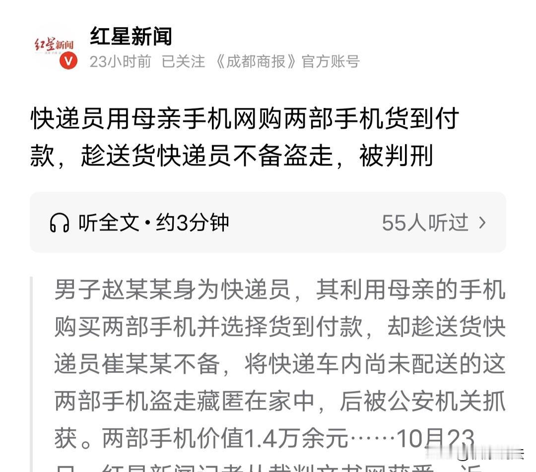 “害人终害己!”哈尔滨,38岁男子是快递员,利用母亲手机网购了2部手机,价值14698元,选择货到付款,之后,男子在小区盯着送货快递小哥,待其停车后,男子趁其不备,把快递车上还未配送的2部手机偷走,藏在家里,他以为神不知鬼不觉,结果,悲剧了! 赵某某1987年生人,已经38岁了,眼看人到中年了,却干了一件让人大跌眼镜的事儿,最终,害人终害己。 赵某某在一家快递公司当快递员,按理说他应该知道快递员的不容易,每天风里来雨里去的忙着给大家送包裹,可他想弄2部手机,却用了一个缺德的招儿。 2025年5月15日,上午8点多,赵某某在家里拿着母亲的手机一顿忙活,原来,他利用母亲手机在某东平台上网购了2部手机,他没付钱,却选了一个货到付款,配送地址是他的家——新华小区。 你以为他这是要“坑妈”吗?不是,他其实藏着坏心思呢,这可不是一次普通的网购。 当天下午3点左右,负责送快递的快递小哥崔某某,来到了新华小区送货,把快递车停在了小区的院子里,此时他还不知道一个同行在暗处盯着他呢。 这时候,赵某某瞅准了机会,趁着崔某某没注意,偷偷把快递车里那2部他买的还没配送的手机拿走了。 然后,赵某某回到家里把2部手机藏了起来,他以为自己做的神不知鬼不觉,可他没想到要想人不知除非己莫为,他偷手机的事很快被发现了。 崔某某找不到手机,报了警,警察很快介入调查。 经过鉴定,这2部手机的价值共14698元。 在2025年5月16日,警察将赵某某给抓住了,那2部被盗手机也被追了回来,并还给了快递员崔某某。 赵某某自作聪明,以为自己偷偷拿走别的快递员配送的手机就能不花钱白得,没想到,害人终害己。 赵某某的打了一个好算盘,其实手机是自己买的,还整个货到付款,以为自己偷偷拿走后,其他派送的同事得赔偿,他等于白嫖。 有人说,“因为自己淋过雨,所以也要撕烂别人的伞”? 且不说最后查出来了,如果没有查出来,那被偷的快递员辛辛苦苦一个月还得赔,真是太坏了。 赵某某自作聪明反被聪明误,再次证明了:害人终害己!若要人不知,除非己莫为,别伸贪手,伸手必被抓! 赵某某也是搞笑,还货到付款,甚至比白嫖还夸张,自己一分钱没出就想白得手机。 这年头还敢做坏事,要安分守法啊,只要想捉你分分钟的事,大数据时代,满街摄像头,除非你会隐形。 最终,法院认为赵某某偷拿别人东西,数额还挺大,他已经构成了盗窃罪。 《刑法》第264条规定、盗窃罪是指以非法占有为目的,盗窃公私财物数额较大或者多次盗窃、入户盗窃、携带凶器盗窃、扒窃的行为。 本案中,赵某某虽为快递员,但两部手机尚未进入其配送职责范围,因为还未完成签收程序,该2部手机仍属于快递公司保管的第三方财物。 但是,赵某某通过秘密窃取手段,趁快递员崔某某不备盗走2部手机,是非法占有财物,符合盗窃罪“以秘密手段非法占有公私财物”的构成要件。 本案中,赵某某盗窃财物价值1.4万余元,达到“数额较大”标准(一般1000元至3000元以上)。 不过,但赵某某到案后如实供述主要犯罪事实,未隐瞒或逃避责任,符合“坦白”情节;同时其自愿认罪认罚,表明悔罪态度,法院据此依法对其从轻处罚。 最终,法院判决:赵某某盗窃罪,判处有期徒刑8个月,并处罚金2000元。 赵某某这事儿干得实在不地道!身为快递员,应该能体会同行的辛苦和不易。 结果他倒好,自己用母亲手机下单买手机,还选货到付款,等同行快递员把货送来,趁人不注意直接把手机偷走藏家里,不管不顾的坑同行。 两部手机一万四千多块,虽说不是天价,但那个快递员崔某某若是找不到,可能面临赔偿。 最讽刺的是,赵某某偷的还是自己“买”的东西,这操作简直像自己挖坑把自己埋了。 要不说啊,做人得讲良心,工作得守规矩,别总想着投机取巧。 对此你怎么看呢? 关注@福康说法 从日常点滴学法律,生活安稳更有底