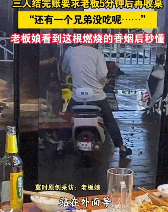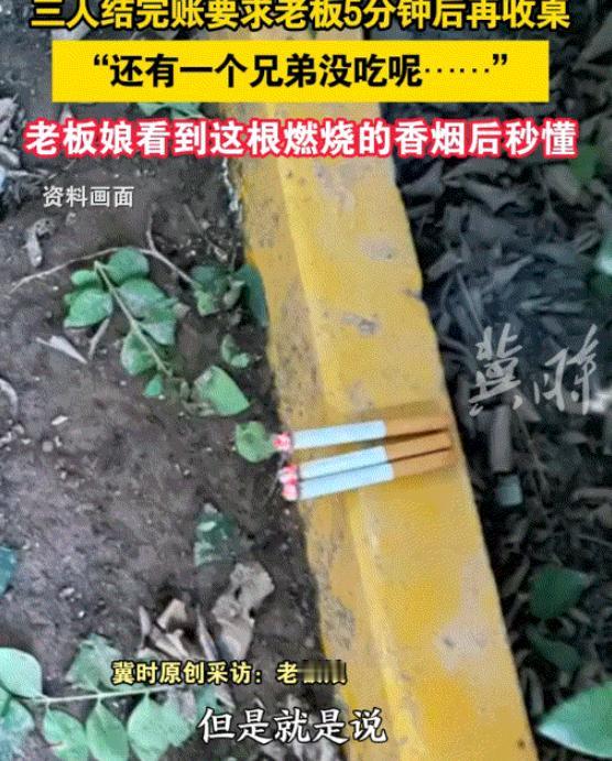 “太感人了?10月23日江苏泰州,三名男子到餐馆吃饭,而三人吃完饭结账后,便希望老板娘等5分钟后再收桌子,说是他们还有一个兄弟没吃,盘子旁边还点了一根香烟,而三人也是一直站在外面,等到香烟燃完后才离开,这时老板娘才反应过来,原来几人这是在等待他们过世的兄弟吃好饭![无辜笑] 在江苏泰州的一家小餐馆,三位客人用完餐后做了一件特别的事,结完账,他们轻声请求老板娘先别收拾桌子,说”还有个兄弟没吃“,需要等五分钟。 老板娘以为还有人迟到,便点头应下,几分钟过去,始终不见第四个人来,她望向刚才那桌,发现桌上特意留了一盘没动过的菜,旁边立着一支点燃的香烟。 那三位男子并未走远,只是静静站在店门外,望着街道,一言不发,直到那支烟缓缓燃尽,最后一点火星熄灭,他们才默默转身,消失在夜色中。 老板娘这时才明白,原来他们是在用这种方式,祭奠一位已经离世的兄弟,据老板娘后来说,这是当地一种表达怀念的习俗,朋友聚会时,会为逝去的伙伴留出位置,摆上碗筷,再点一支他生前爱抽的烟。 席间每上一道新菜,大家会先往那个空盘子里夹一些,象征与他一同分享,这个简单的仪式,重点不在形式,而在情谊,即便人不在了,朋友们仍习惯性地”带上“他,仿佛他从未离开。 在这个讲究效率的时代,这种不张扬却持续多年的惦念,显得格外厚重。它让我们看到,真正的告别也许从来不是忘记,而是用另一种方式记得。 看了泰州三位男子用一顿饭、一支烟祭奠过世兄弟的故事,很多网友都被这份深厚的兄弟情谊深深打动: ”这大概就是真正的兄弟情吧,人走了,情分一点没散,这几位大哥是重情重义的真汉子!“ ”细节最戳人,留菜、点烟,做的全是兄弟生前习惯的事,这不是走过场,是真心实意的想念。“ ”我们老家也有类似的风俗,过年过节吃饭都会给逝去的亲人摆上碗筷,感觉他们一直都在。“ ”人生得一知己足矣,能有这样一群朋友,这位先走的兄弟这辈子也值了,想想自己,身边还能一个电话就叫出来吃饭的朋友还有几个?“ ”朋友在精不在多,关键时刻能站出来的才是真朋友,这几位大哥的做法,给‘朋友’这两个字做了最好的注解。” 你是否也曾用某种特别的方式,纪念过一位重要的朋友或亲人? 官方信源:新华网