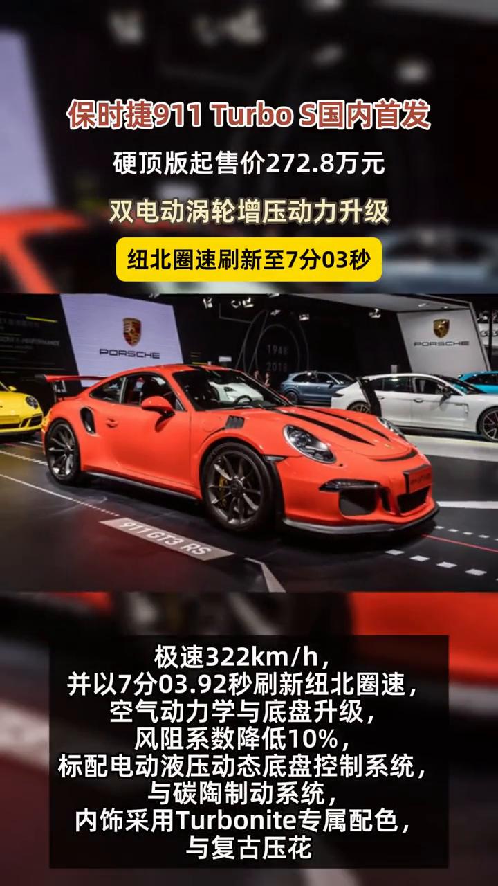 保时捷911 TurboS国内首发,硬顶版起售价272.8万元,双电动涡轮增压动力升级,纽北圈速刷新至7分03秒。 保时捷新款911 Turbo S系列将在2025进博会国内首发,硬顶版售价272.8万元起,敞篷版287.8万元起。 新车搭载3.8升发动机,配双电动涡轮增压系统,最大功率711马力,峰值扭矩800牛·米,零百加速2.5秒,极速322km/h,并以7分03.92秒刷新纽北圈速。空气动力学与底盘升级,风阻系数降低10%。标配电动液压动态底盘控制系统,与碳陶制动系统。内饰采用Turbonite专属配色,与复古压花。