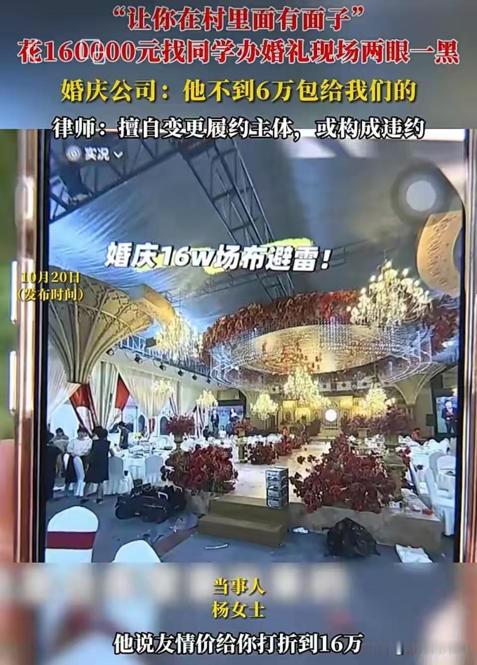 十六万一场婚礼,图的是同学一场的信任,换来的是眼前一黑。浙江台州温岭市大溪镇的杨女士,这个国庆过得五味杂陈。未婚夫的高中同学符先生拍着胸脯打包票,保证婚礼办得风风光光,让全村人羡慕得能念叨三天。一份二十万到二十四万的报价单,被他以同学情谊折价到十六万,承诺的效果却是价值二十万的奢华。这份人情,这份承诺,谁能不心动?红金巴洛克风格的效果图金碧辉煌,杨女士满心欢喜地等待着梦想成真。 婚礼前一天的彩排,成了梦碎的时刻。踏入现场的那一刻,杨女士的心沉到了谷底。这哪里是什么奢华巴洛克,分明是粗制滥造的敷衍。现场一朵鲜花都见不到,就连假花也稀稀拉拉,上面还蒙着灰尘,颜色都褪了,一股陈旧感扑面而来。本该挂满婚纱照的迎宾背景墙,竟只是一块廉价的喷绘KT板,连个像样的相框都没有。承诺的甜品区、小喷泉,更是惨不忍睹。这十六万,难道就换来了一场“将就”的仪式?杨女士当即决定,尾款不付了,必须讨个说法,一个道歉是底线。 她把自己的遭遇发到网上,本是无奈之举,却意外牵出了背后的真相。真正的婚庆公司看到视频后,主动联系了杨女士,他们的一句话点醒了梦中人:这场布置,他们从符先生手里接单,总价还不到六万。十六万与六万,中间那巨大的差价,去了哪里?杨女士这才恍然大悟,同学赚的这笔钱,本无可厚非,可他没有做到应有的效果,没有兑现当初的诺言。这已经不是简单的生意纠纷,而是对信任的践踏。面对质问,符先生三缄其口,直接请了律师,摆明了要走法律程序。 这桩闹剧,说到底是一场承揽合同的根本违约。符先生作为承揽人,理应亲力亲为,至少要保证最终成果与承诺相符。他不仅擅自将业务转包,交付的成果更是与约定南辕北辙,这已然触犯了法律的红线。法律专家指出,杨女士完全有权利解除合同,要求返还部分款项,并索赔因此造成的额外损失。这场风波,也给所有人提了个醒,亲兄弟明算账,熟人之间谈生意,更要把丑话说在前面。一份详尽的合同,远比一句口头承诺来得实在。别让面子工程,最后丢了面子,还伤了里子。 -------------------------------- 以上内容由AI生成,仅供参考和借鉴