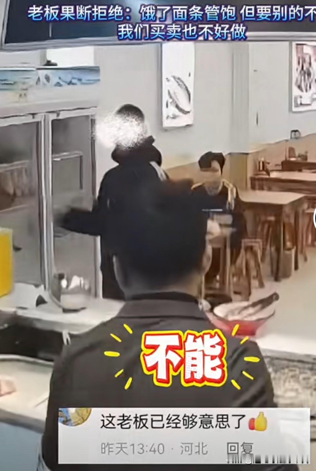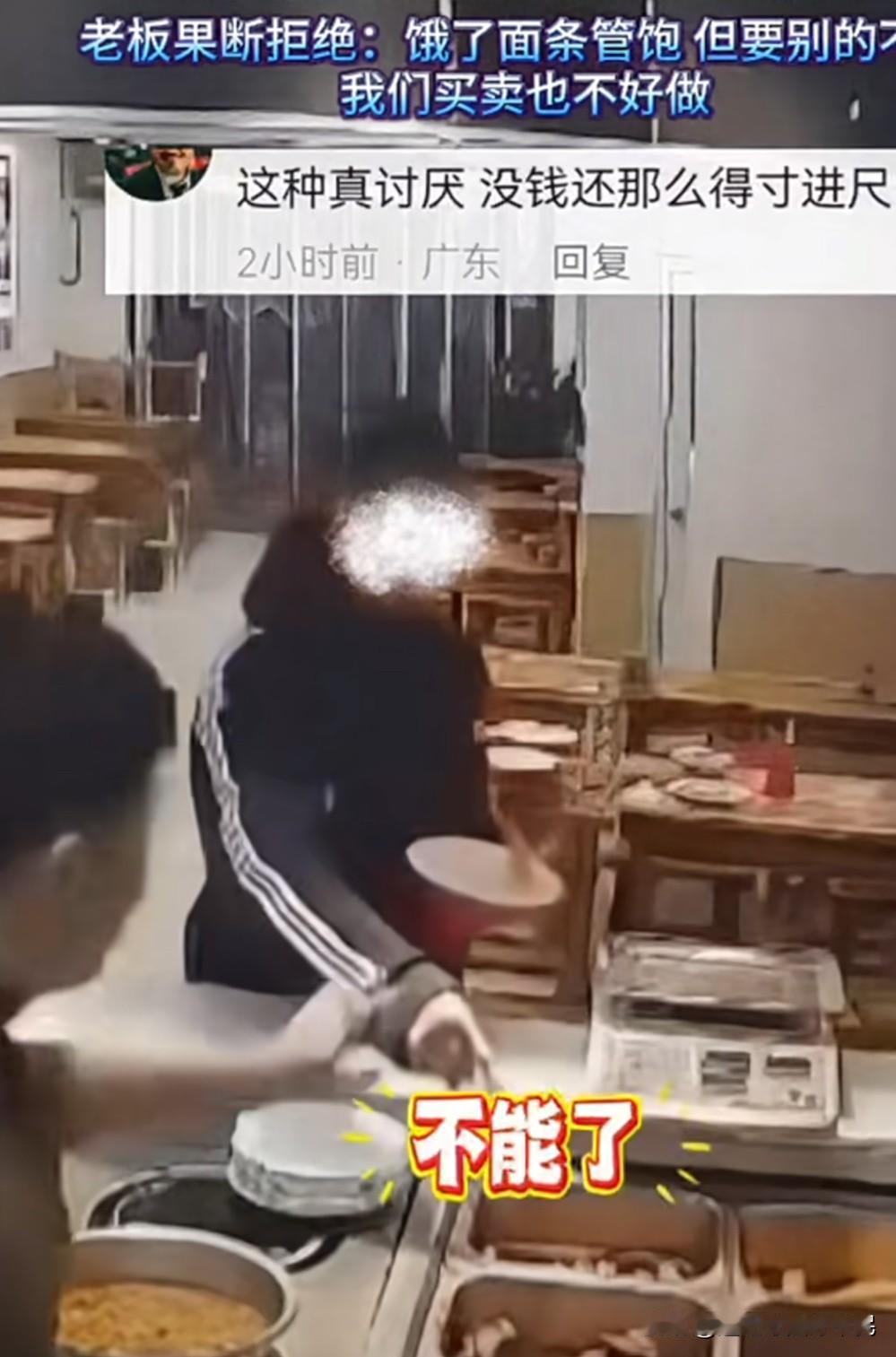 男子晚上饿了点了一碗牛肉面,等老板煮好交给他的时候,他才说自己没有钱,老板听到以后也没有为难,说1分钱没有,那你就免费吃吧。 这位男子吃完了以后指着柜台前边的容器说,还想吃一个棒骨,老板拒绝了。老板拒绝以后,他说想喝水,老板告诉他柜子里有碗,那边有热水可以喝。但是男子走到饮料柜,指着柜子说想喝一瓶饮料,老板也拒绝了。告诉他没钱吃饭可以面管饱,其他的都不会给。 整个过程看来这个人不是饿了,是馋了,他就是利用人的善良,满足自己的口腹之欲。这名男子把人性的贪婪得寸进尺,表现的淋漓尽致。