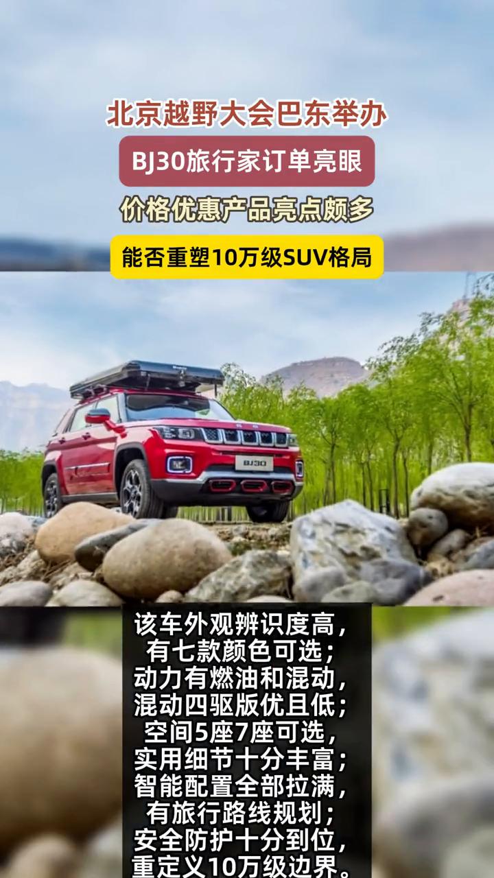 北京越野大会巴东举办,价格优惠,产品亮点颇多,能否重塑10万级SUV格局? 2025北京越野用户大会近期在湖北巴东举行,主角BJ30旅行家"超野、超省、超大"旅行焕新系列官方指导价9.99-13.69万,旅行焕新价8.39-11.89万,上市24小时订单破16859辆,累计销超5.6万辆。 该车外观辨识度高,有七款颜色可选;动力有燃油和混动,混动四驱版优且低;空间5座、7座可选,实用细节十分丰富;智能配置全部拉满,有旅行路线规划;安全防护十分到位。重定义10万级边界。