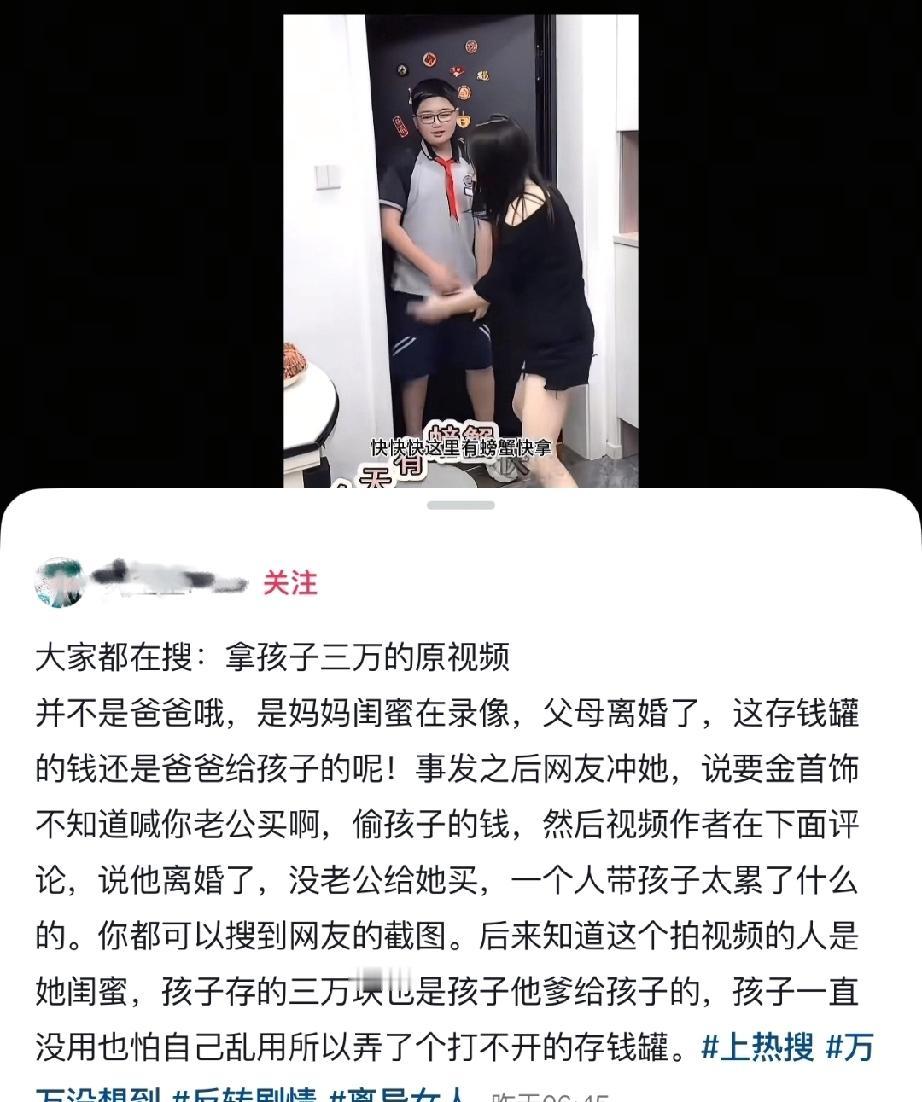 单亲妈妈撬开儿子存钱罐,偷走3万块给自己买金手镯。晚上还专门在儿子面前炫耀手镯,顺带告诉儿子钱是从哪来的,让闺蜜拍下儿子的反应! 知情人透露儿子攒的钱都是爸爸给的零花钱。 网友吐槽:坑爹坑妈的看的多了,坑这么小的儿子的确实很少看到! 但愿这个视频就是一个剧本,如果确实是真实的发生的,我只能说,这可能是这个男孩此生被坑的算小的事情,可能以后他这个妈妈还有更大的坑让他踩! 各位看官,你们觉得呢?