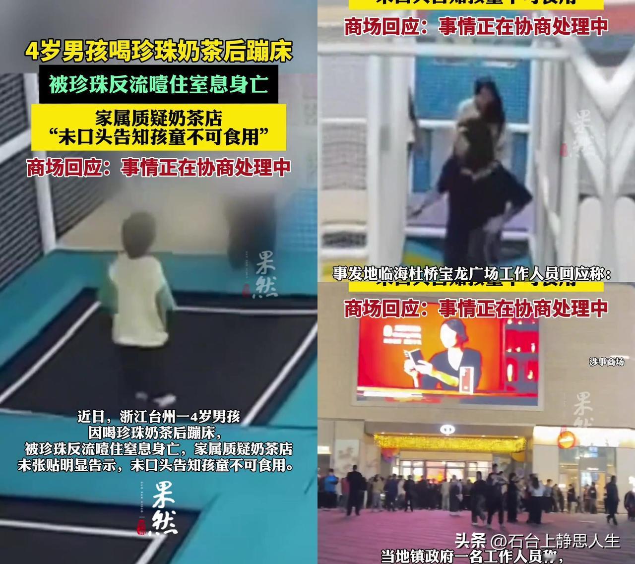带娃的都醒醒! 浙江台州4岁男孩喝珍珠奶茶后蹦床,珍珠反流噎住没了。家属告奶茶店、商场,说没口头提醒。 有人说该怪商家,有人说该怪商场,还有人调侃咋不怪自己给娃买。 谁带娃没犯过心疼式妥协?娃盯着奶茶店灯牌哭,你是不是心软就一口没事? 4岁娃喉咙才硬币大!珍珠嚼不碎、蹦跳一颠就反流,这是家长该先绷的安全线啊! 大家说告六个核桃没考上大专、告老婆饼没老婆,最让人警醒的是,看护不是盯着娃,是先判断这东西娃能不能碰! 奶茶店小程序早有提示,可家长要是先妥协,能怪别人吗? 你会给4岁娃喝珍珠奶茶吗?娃闹着要危险小零食,你妥协过吗?