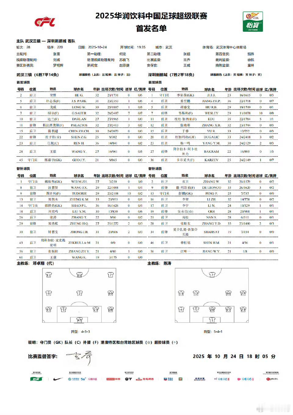 武汉三镇vs深圳新鹏城 首发,深圳新鹏城4外援+拜合拉木首发,主队也是4外援首发。虽然廖力生此前已跟队训练了,但是他这次依旧未和球队一起去客场。