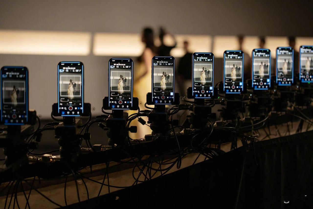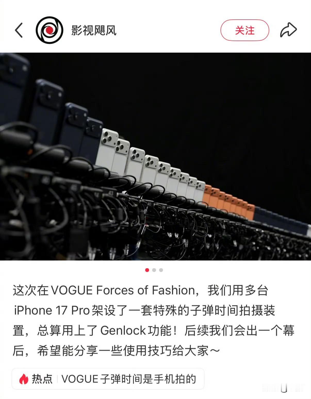 把几十台iPhone 17串成一串,影视飓风又干大活儿了! 就在刚才,影视飓风来了一个小预告,他们用一串iPhone 17 Pro 拍摄出来格莱格莱美颁奖典礼上面的那种子弹效果! 现在的iPhone 17 Pro 不便宜,他们直接弄了一串出来,目前具体不知道到底有多少台手机这样串联起来的,但是保守估计都是几十台,也就是说这种拍摄其实比那种入门级的单反相机的成本还要高! 他们现在只不过是做了一个预告的片子,最终的活动全程记录还没有出来,到时候看看他们是怎么样把这么多苹果手机串联起来的,并且实现了统一的控制。 如果他们到时候把这些细节全部都表现出来了,那么我们平时也可以模仿,用它这么多手机,因为成本确实太高了,即便是用几台手机传染起来,能够拍出这种感觉也是很舒服的。 至于效果怎么样我做成了一张动态图片,大家可以看一下再第二张图片,因为他们也只是呈现了一小段,所以并没有完全看得出来这个效果有多么的震撼,但是还是能够感受到确实有那种感觉。