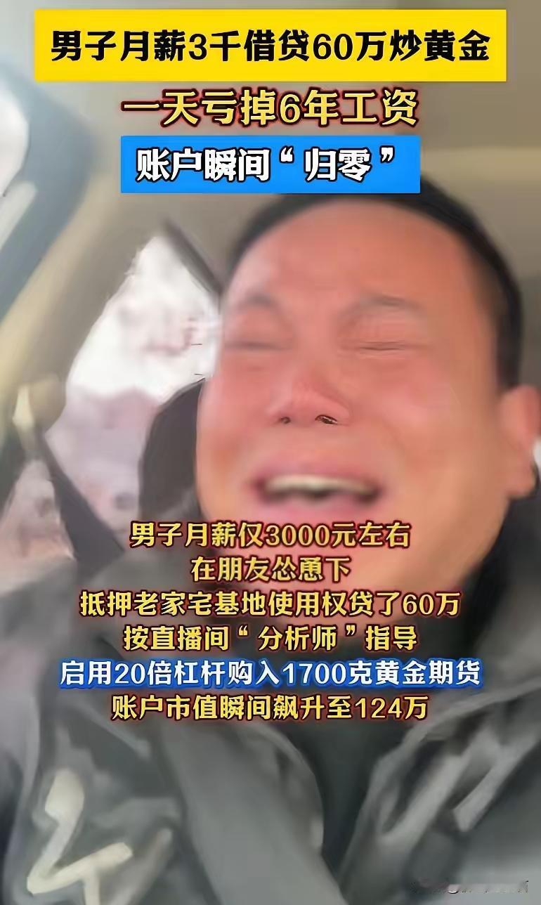 月薪3000的何某太惨了!今年年初,他在朋友怂恿下,用信用卡、消费贷、网贷凑了60万满仓黄金,还参与期货交易。4月22日黄金迈过3500美元/盎司关口后开启跳水模式,23日COMEX黄金单日跌幅达3.45%,他一天就亏掉6年工资。 网友评论: 我不太懂这个,但是3500入手,10倍杠杆,就以今天4100算,已经赚了1.7倍102万了啊?为啥说他亏了? 这种货根本不值得同情,老想着投机取巧发大财,关键还是借的钱,如果发了财就是自己的,赔了就是银行的!讨吃货。 60万10倍杠杆,但最近黄金只跌了6%不到,所以金融机构也平不了他的仓,从年初买到现在他赚了不少。 我感觉没啥啊,以前每月3000现在还是3000一个月,不耽误吃喝。就3000一个月平时也没高消费过啊。其实真没有啥,又不失信。就是天天催债电话多一点。