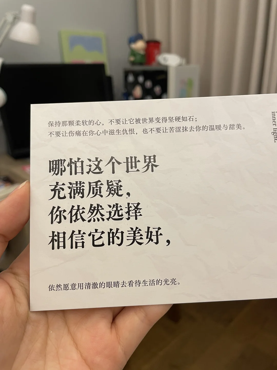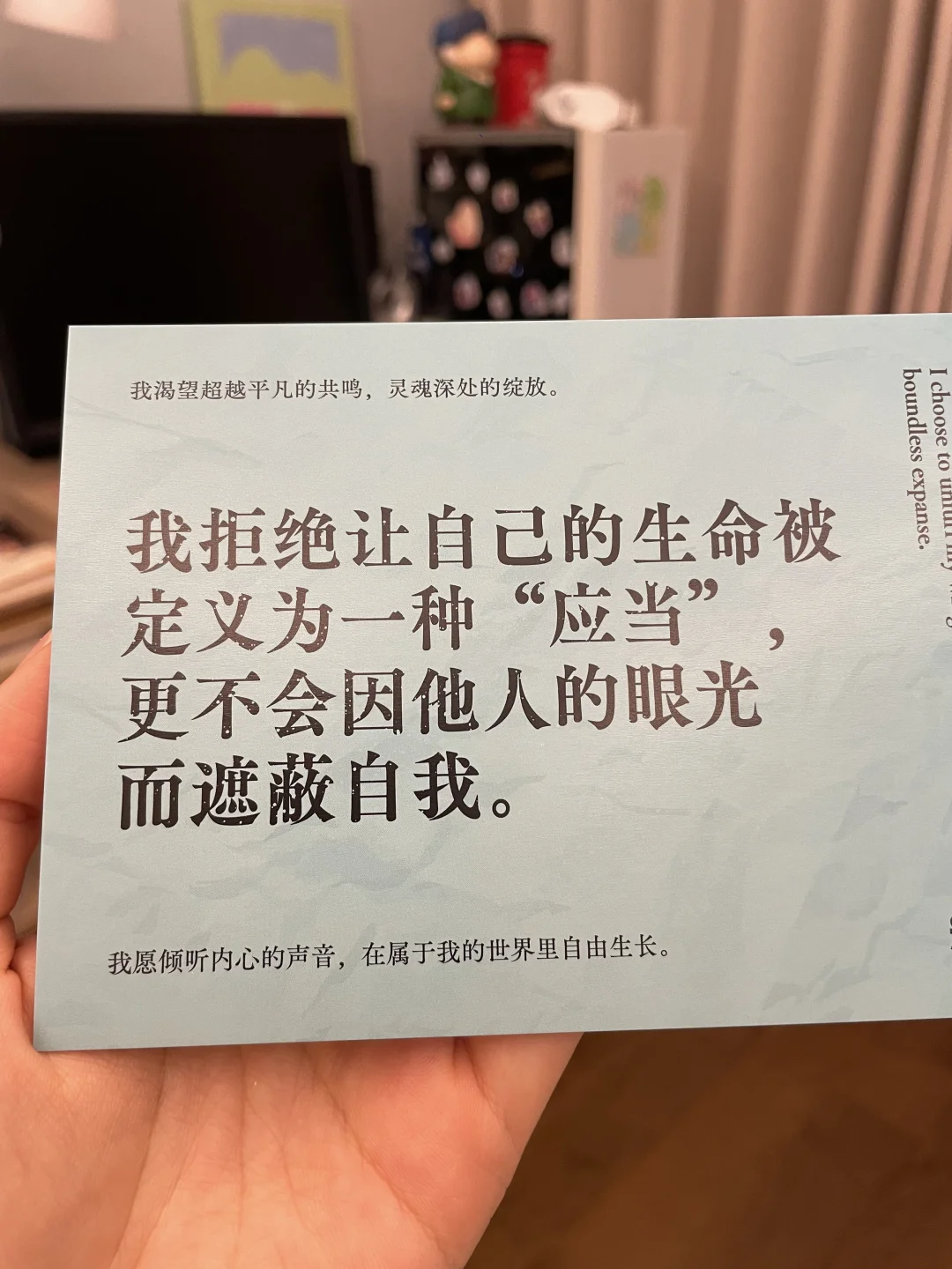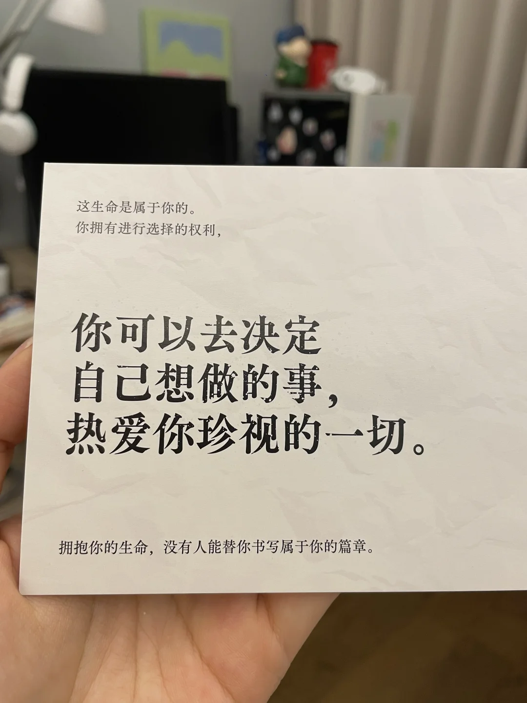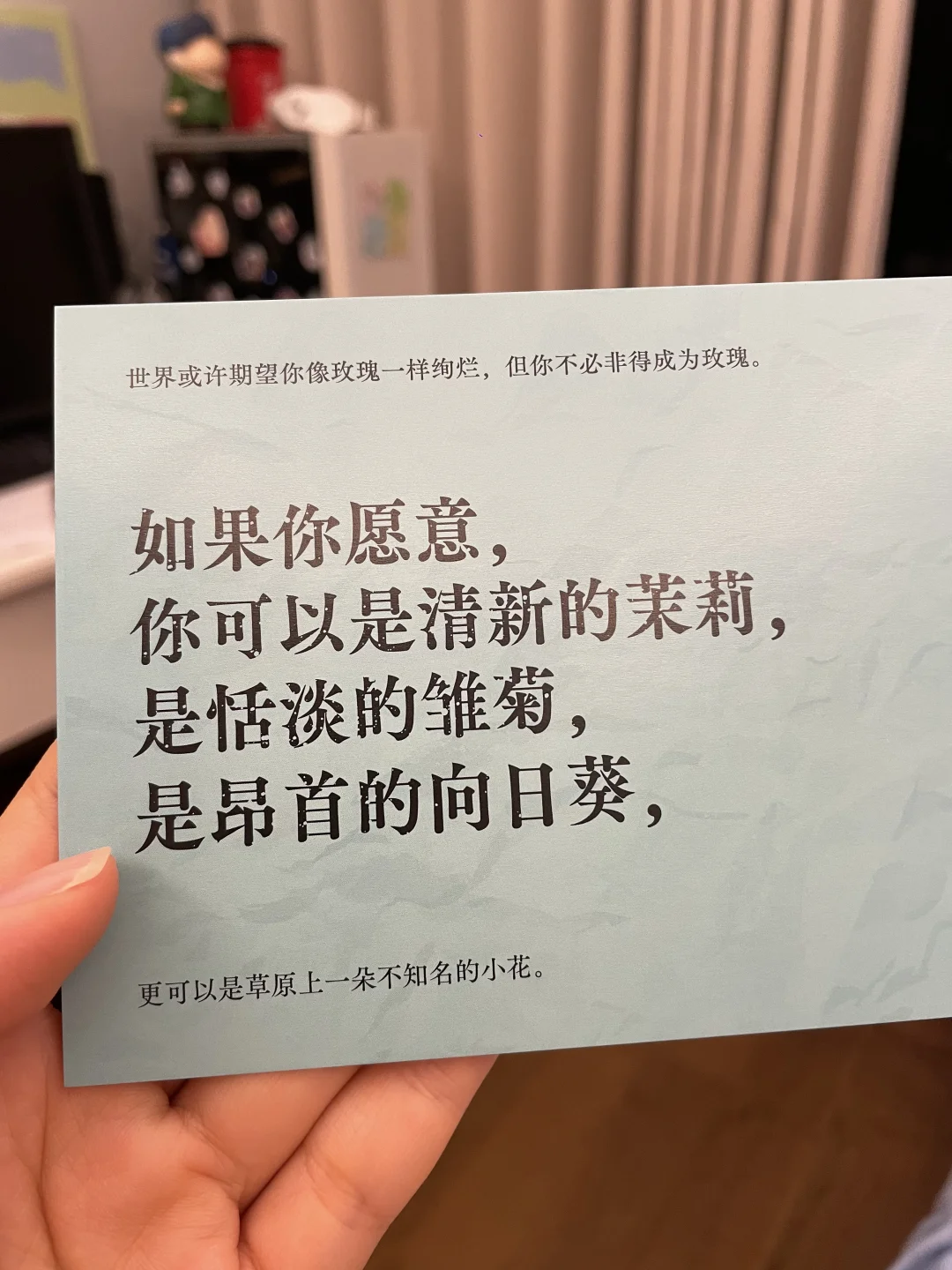 你的存在本身就是一个奇迹 你是被深深爱着的 — 如果你愿意 你可以是清新的茉莉 是恬淡的雏菊 是昂首的向日葵 — 你可以去决定自己想做的事 热爱你珍视的一切 — 浇灌你的心 幸福将从你心底悄然绽放 — 生活自有节奏 步履悠然 既不急于求成 也不被焦虑裹挟 — 漫漫人生路 不要因为一时的纷扰得失而停步 你将目光投向自己 你便成为自己命运的主宰 — 哪怕这个世界充满质疑 你居然选择相信他的美好 — 我拒绝让自己的生命被定义为一种应当 更不会因他人的眼光而遮蔽自我