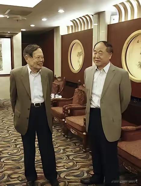两位中国的杰出人才的一张珍贵合影! 这张珍贵合影拍摄于2013年,两位诺贝尔奖获得者的一张珍贵合影,很多人说莫言和杨振宁比起来不是一个档次的!说杨振宁分量更高!但我不这么认为,甚至我感觉莫言的奖励更具备影响力!因为众所周知一位中国人如果想拿诺贝尔奖,几乎是难如登天!一个出身贫寒家庭孩子的莫言他做到了,所以相对来说,我感觉莫言更伟大!不是么?