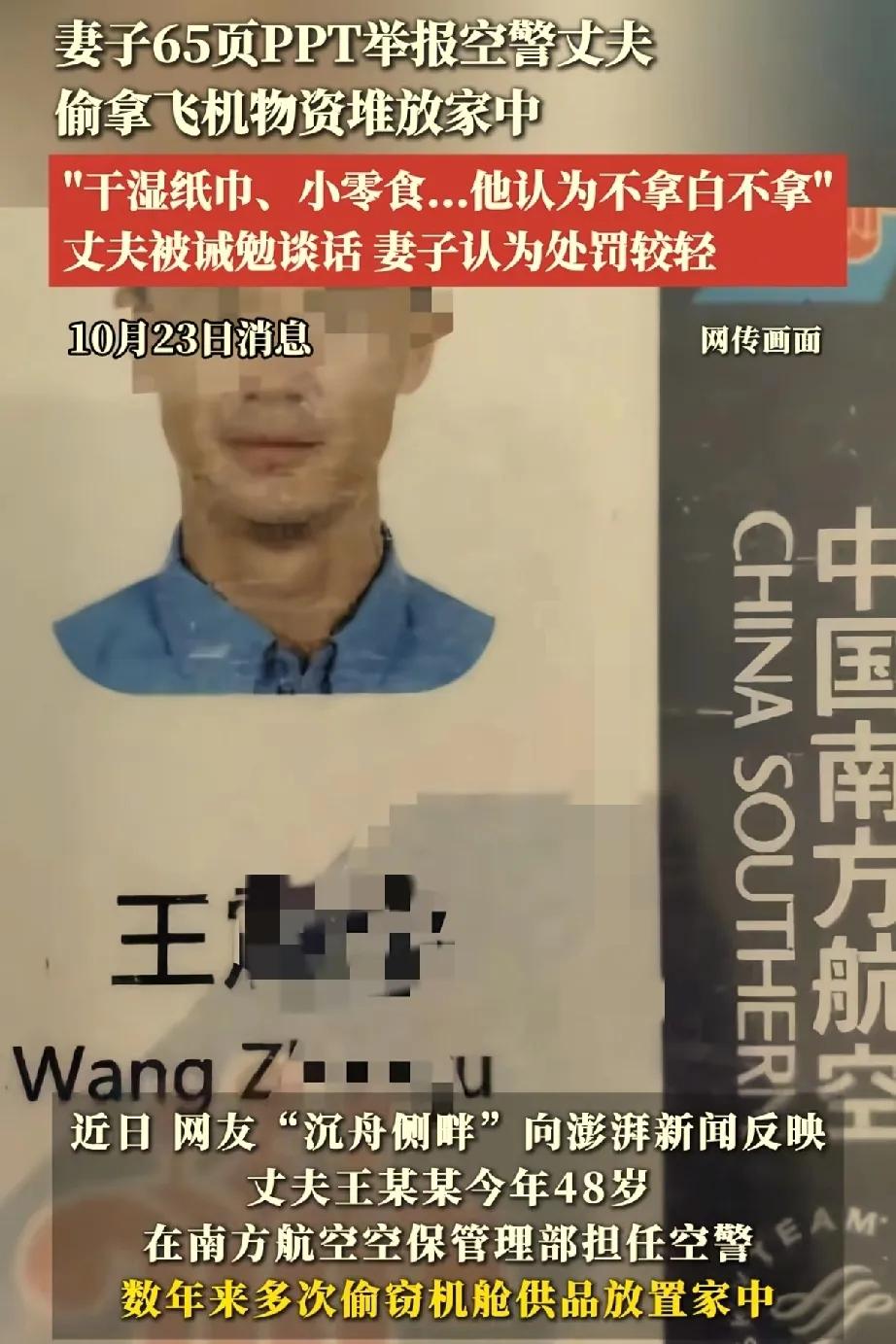 有时,想害你的人,就是你的枕边人,为了离婚,无所不用其极! 48岁的南航空警,就因为把飞机上用剩下的拖鞋、小面包、湿纸巾带回家,结果被老婆做成65页PPT举报“吞公司东西”,就为了离婚能占上风。关键是,这些东西她自己也用着,转头就把老公的顾家小心思,变成了攻击的武器,这心也太狠了吧! 其实啊,愿意把外面这些不起眼的小东西往家带的人,才是真的把家放在心上。他不是贪小便宜,是觉得扔了可惜,想给家里省点,这份踏实比啥都珍贵。可一旦感情没了,连这点温情都能被扭曲,真的比寒冬里泼冷水还让人难受。 你身边有没有这种“抠搜”却特顾家的人?要是碰到为了离婚啥都做得出来的伴侣,你会咋应对?评论区说说你的想法!