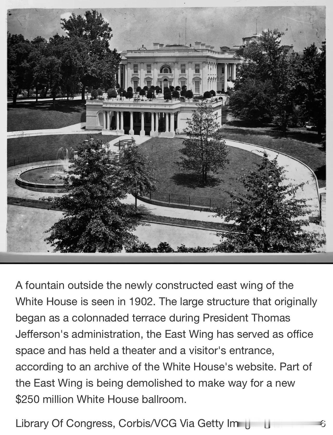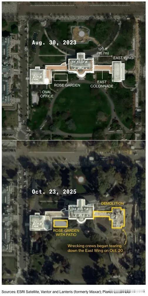 从卫星照片看,白宫已被川普铲平了三分之一,包括东翼建筑、东部柱廊、玫瑰花园,都是以前可供游客参观的部分。被川普砸掉的东部柱廊是杰斐逊当总统时建的文物。美国的文物保护法管不到川普。有一个首都建筑规划委员会,主席是川普的白宫人事部长,他说拆除建筑无需批准,建才需要批准。