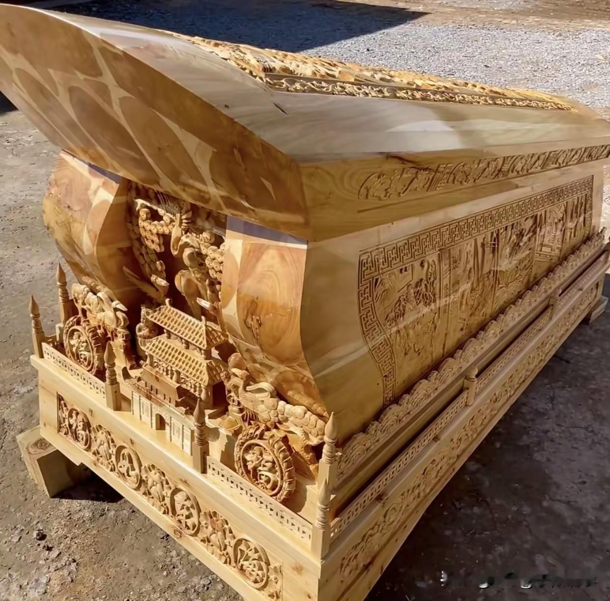 寓意挺好的,见棺发财大吉大利!话说回来,这超豪华级的棺材,用料自不必说了,采用传统制作材料柏木,柏木坚硬致密,富含油脂,能有效防腐驱虫,棺木四周雕梁画栋,栩栩如生,尽显奢华之气!阳世有豪宅习以为常,这等棺材还是第一次见,开了眼了。