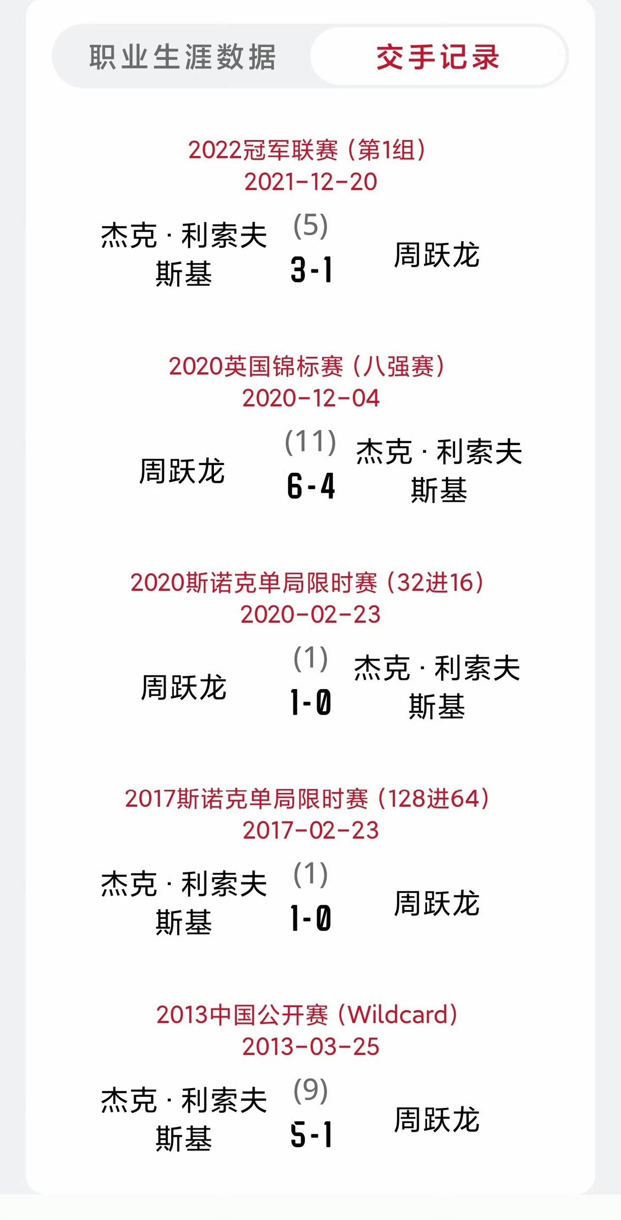 今晚斯诺克北爱尔兰公开赛半决赛,周跃龙对阵利索夫斯基,两人此前交手8次,利索夫斯基5胜3负,不过这还是两年前的比赛。 两人同属“千年老二”,排名分列一二,另外一个决赛对手特鲁姆普或者艾伦,两人都打不过。 谁赢了依然还是千年老二,但挥拳哥还是得继续前进,争取多拿一个亚军。
