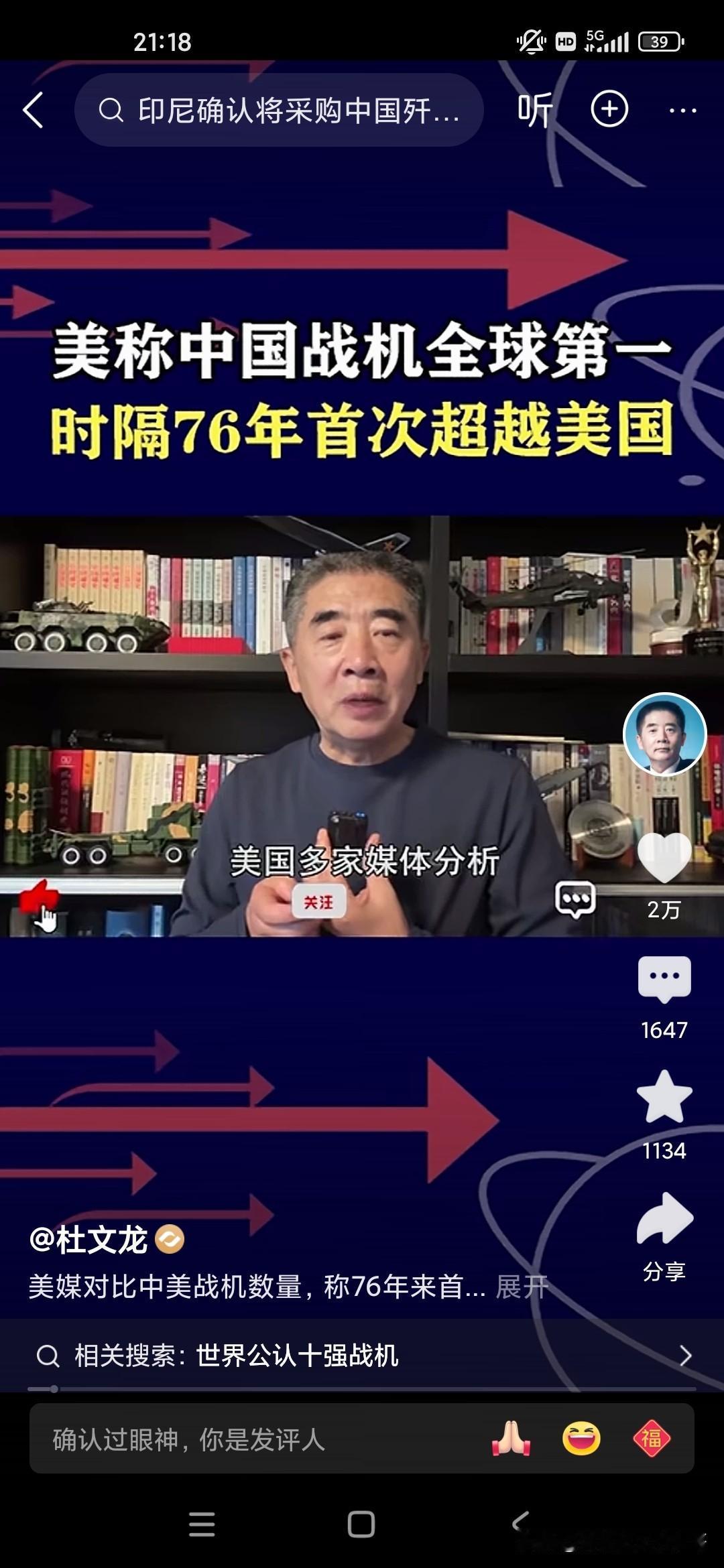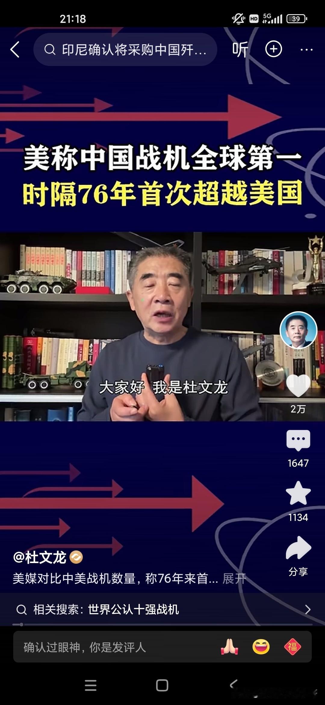 刚才听了杜文老师的演讲,才知道中国的战机76年以来首次超过美国。美国为什么那么的焦虑?他通过各种各样的手段来打压中国,无论是提高对中国的进口关税,还说通过荷兰来强取中国的芯片企业,还是想方设法设法挑动让菲律宾挑动中国南海找事儿,还是让日本或者韩国然后呃通过台湾问题来牵制中国,或者说通过缅甸与泰国的战争来挑动中国周边混乱,或者说是与巴基斯坦眉来眼去,都是希望能够在中国周边引起战火,中断中国的现代化进程,而我们国家的国策是只要不发生大规模外敌入侵战争,我们就不会主动挑起战争啊,我们的国策就是坚持改革开放100年不动摇,坚持共产党的领导100年不动不动摇!所以说美国现在想狗急跳墙,他们也没有拒绝我们的军事实力了,如果在上世纪90年代还有可能,但是后来海湾战争把我们彻底打醒了,包括99年轰炸我们的大使馆,还有01年撞我们的飞机,都让我们饱受耻辱,我们奋发图强,奋斗了20多年,我们终于追赶上来了,我们再也不像以前唯唯诺诺了,我们敢于对美国说不了!