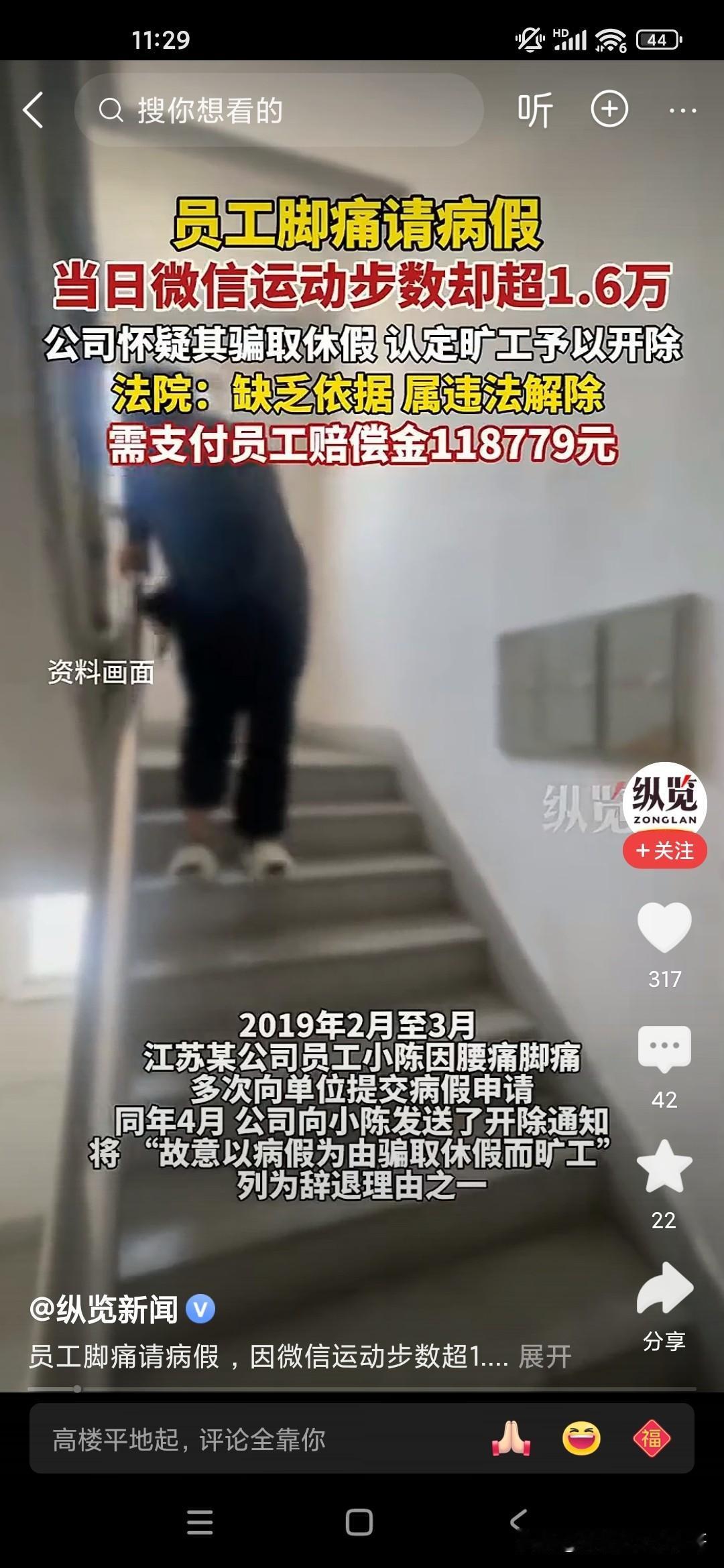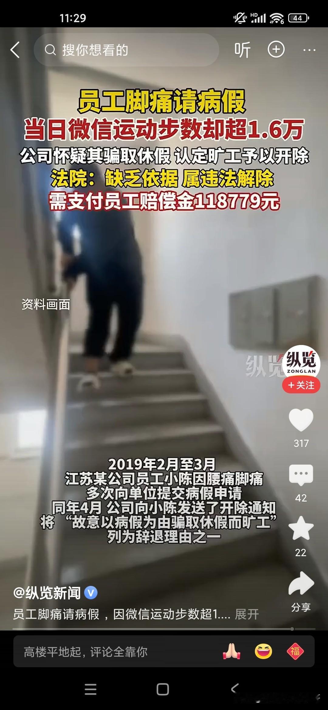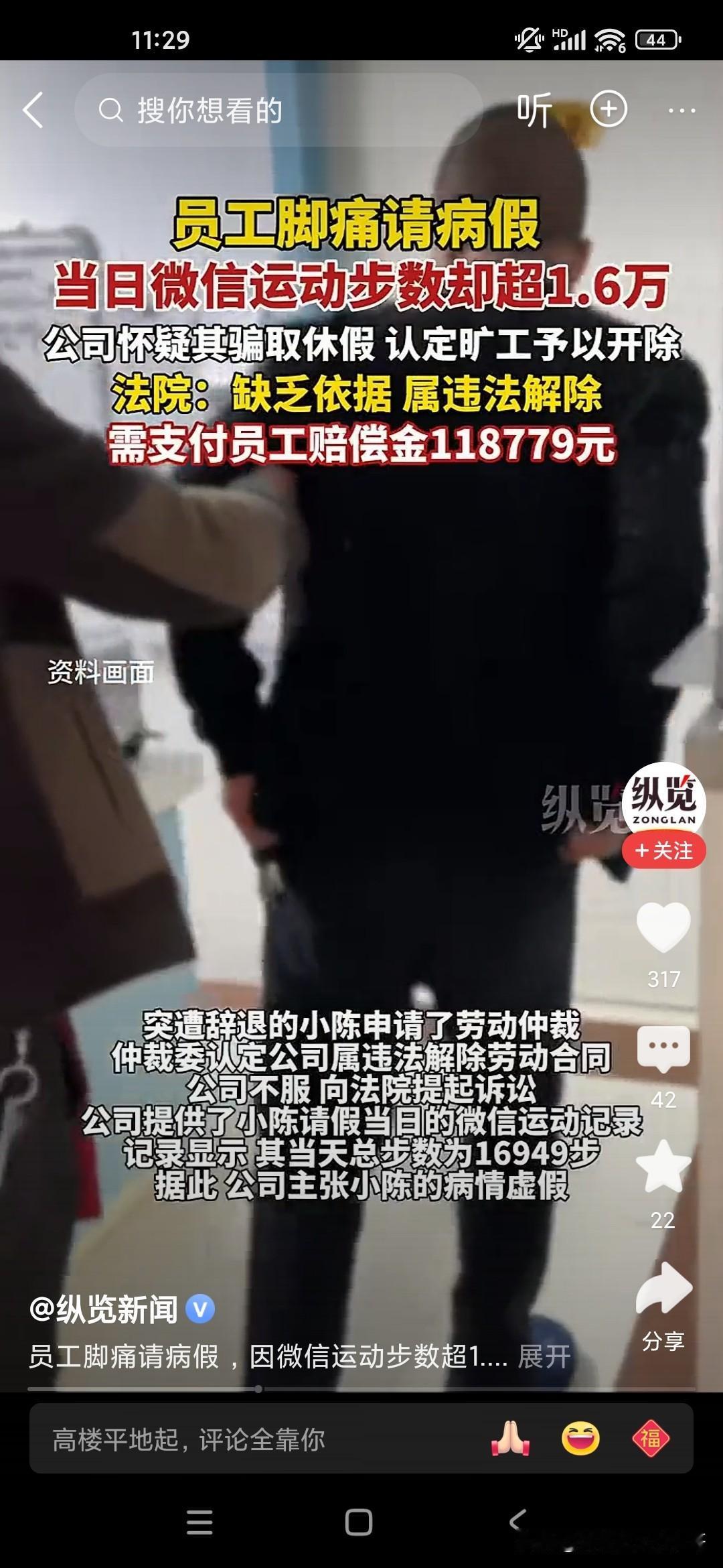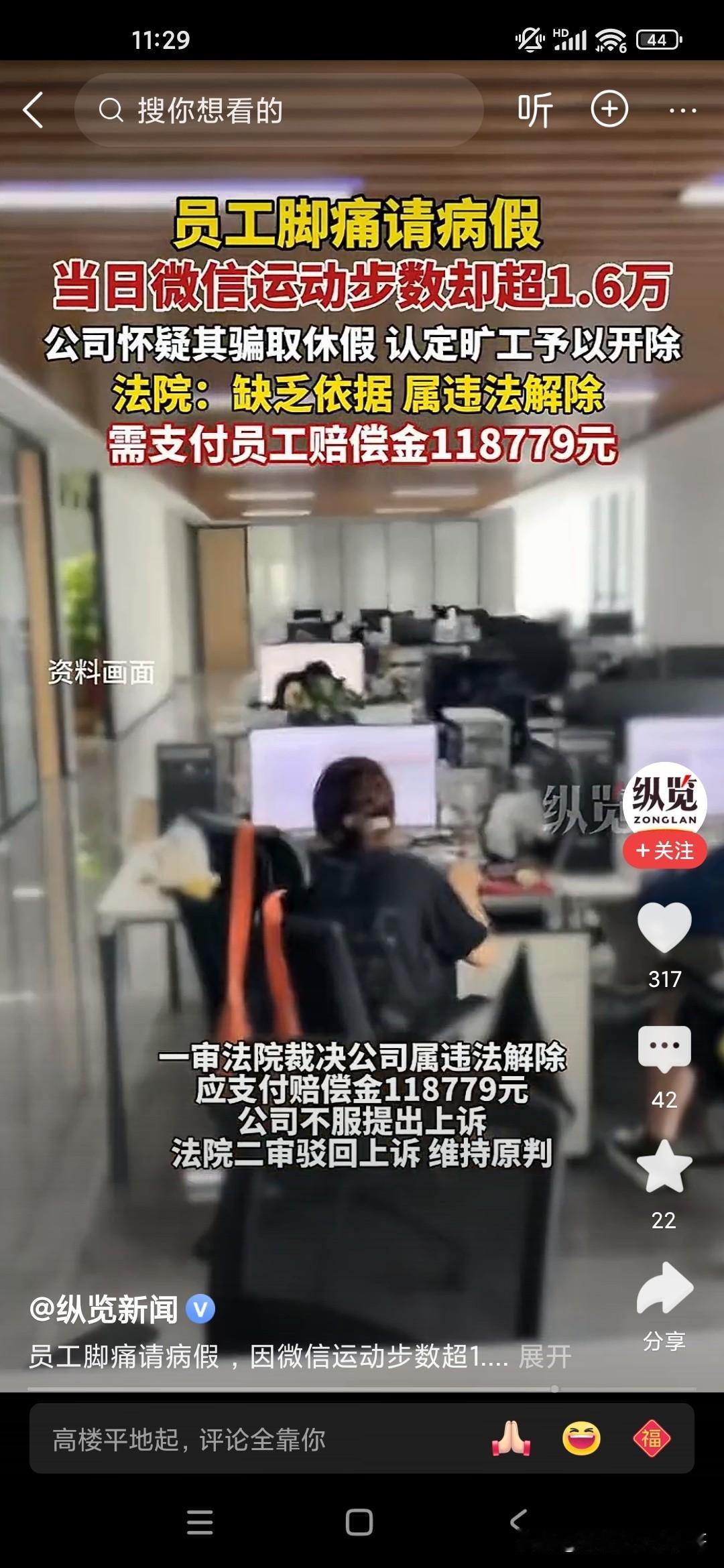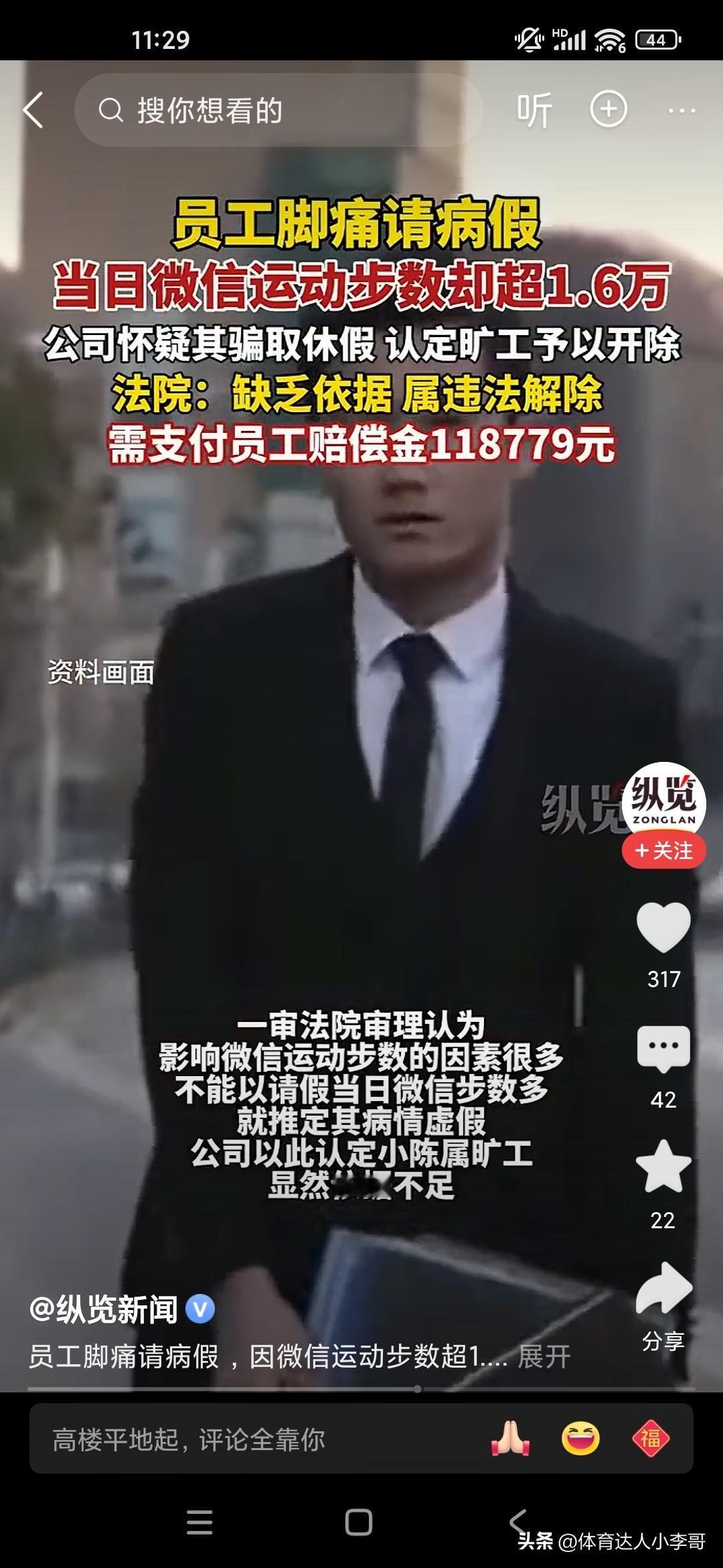 如果你脚崴了,请了个假,结果老板发现你的微信步数超过了1万步,然后就要求要开除你,你能不生气吗?江苏这位男子就遇到了同样的问题,他因为脚受伤了,请假那一天他自己可能带的是苹果手表上面有记步数,也可能是手甩动了还是移动了,然后超过了16000步,同步到他的老板那里,他老板看到他🦶受伤了竟然能走16000多步,认为他脚没啥毛病,非常气愤,就认为请假的这个男子是在说谎,就把他开除了,这名男子当然不依了,他自己本来受伤,还有医院的诊断证明,然后的话他对于公司的开除决定当然是不服气,然后就把他公司告到了法院,法院认为公司以事实依据不可靠,然后的话经济平呃部署,然后就判断这个员工说谎开除,而且员工也履行了正常的请假手续,认为公司违法,然后判赔偿这名男子11万多,公司不服,还进行了二审,二审仍然维持原判,这也给所有的公司老板提了个醒,不要用自己的情感去判断一些事实,本来是一件小事,结果丢了芝麻,赔了西瓜!