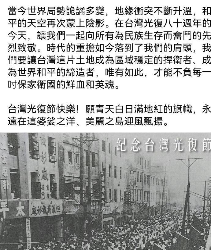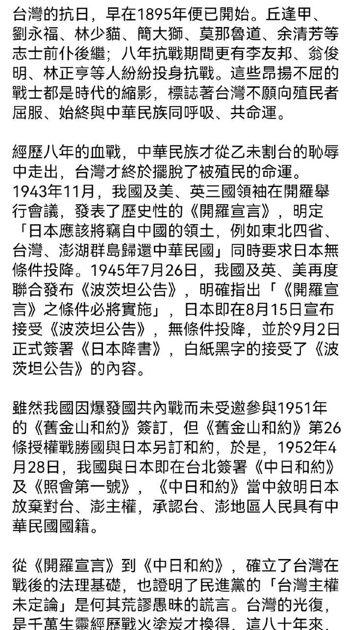 点赞了,郑丽文今天发文纪念台湾省光复,文章追溯历史,指出台湾的抗日是从1895年开始的,台湾同胞从未向殖民者屈服。八年抗战胜利,中华民族才从乙未割台的屈辱中走出来,台湾才终于摆脱被殖民的命运。没有抗战胜利,就没有台湾光复。而且1943年的《开罗宣言》和1945年的《波茨坦公告》都明确指出台湾、澎湖诸岛属于中国领土。这些都说明了民进党的所谓“台湾主权未定论”是多么愚昧荒谬的谎言。 笔者观点,郑丽文的发文始终站在了中华民族的立场上来看待台湾光复,驳斥了民进党的“台湾主权未定论”。当然因为历史的局限性,她也提到了已经灭亡的中华民国,这一点不可取。除此之外,这确实是一篇雄文!郑丽文当选后频繁接受专访,并撰文,意图很明确,就是要更正目前岛内的所谓“主流民意”,重新定位和掌握新的主流民意!