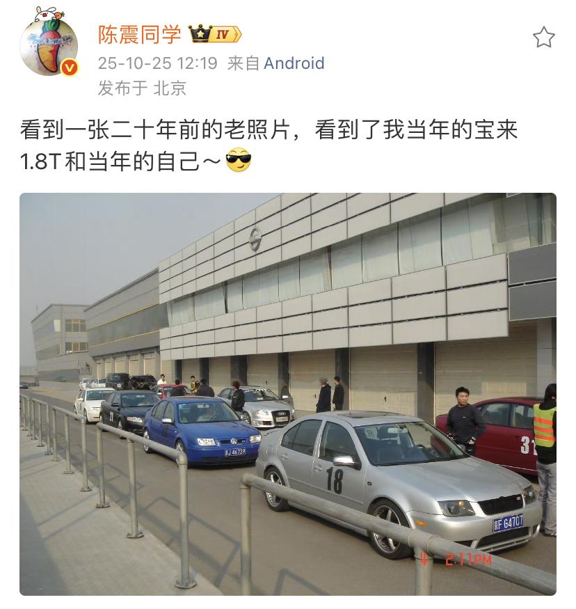 陈震:看到一张二十年前的老照片,看到了我当年的宝来1.8T和当年的自己~[酷] 20年前的陈震同学还没有现在这么有钱,开的还是宝来呢。 所以说多年前就做汽车媒体相关行业是多么正确的选择,陈震也是现在自媒体这条路没有跑通,之前就在社交频道上更新相关东西的测评人,确实是挺神奇的。