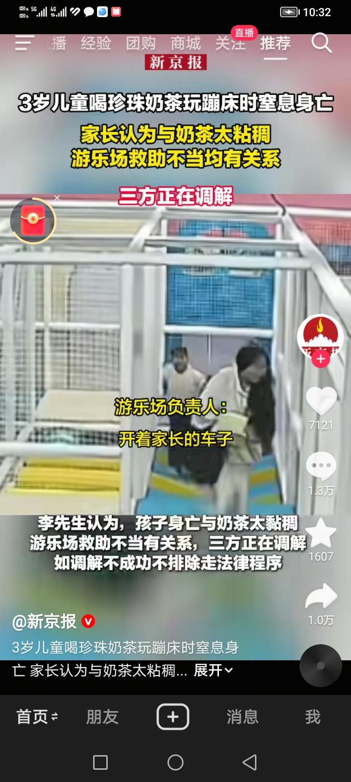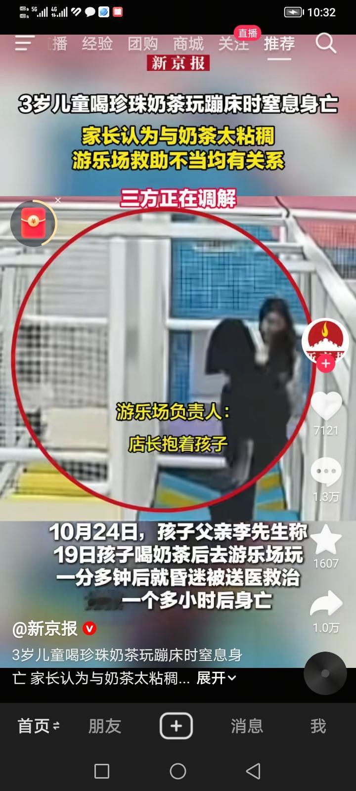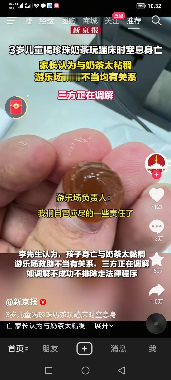 大家这一两天都应该刷到一个三岁幼童蹦床时家长给他喝珍珠奶茶,后面窒息死亡,现在家长起诉奶茶店事件。现在许多家长自己不认真看护孩子,自己没尽到义务就把责任推卸给别人,好讹钱,孩子在这这些家长眼中就成了摇钱树。是个人都知道三岁孩童怎么能喝珍珠奶茶,还是在孩子玩蹦床时,我小的时候家长一直告诫告过吃饭前后30分钟时不要运动。孩子家长一点不把孩子的安全放在心上,也不反思自己的行为,把所有的责任都推给别人,这样的家长都没资格做父母(图片信息来源:@新京报)。奶茶 窒息 奶茶异物事件 上海奶茶店事故
