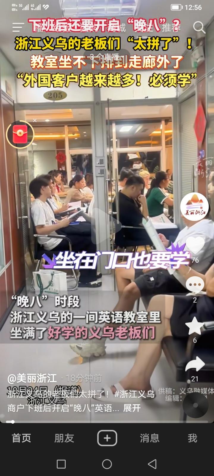 下面的几张图片很好的诠释了为什么义乌叫世界的义乌,这是晚上8点时间段,一些老板们还在学习英语,他们有些老板都已经五六十了,六七十都有,但他们依然孜孜不倦的学习,教室里坐不下,就坐在走廊里学习。许多人想赚钱又不愿意花时间去学习,幻想着生意会从天而降。想要幸福的生活不是一蹴而就的,而是一点一滴自己拼搏而来的。这就是义乌精神,也是浙江精神。(图片信息来源:@美丽浙江)世界义乌 义乌打工 义乌店