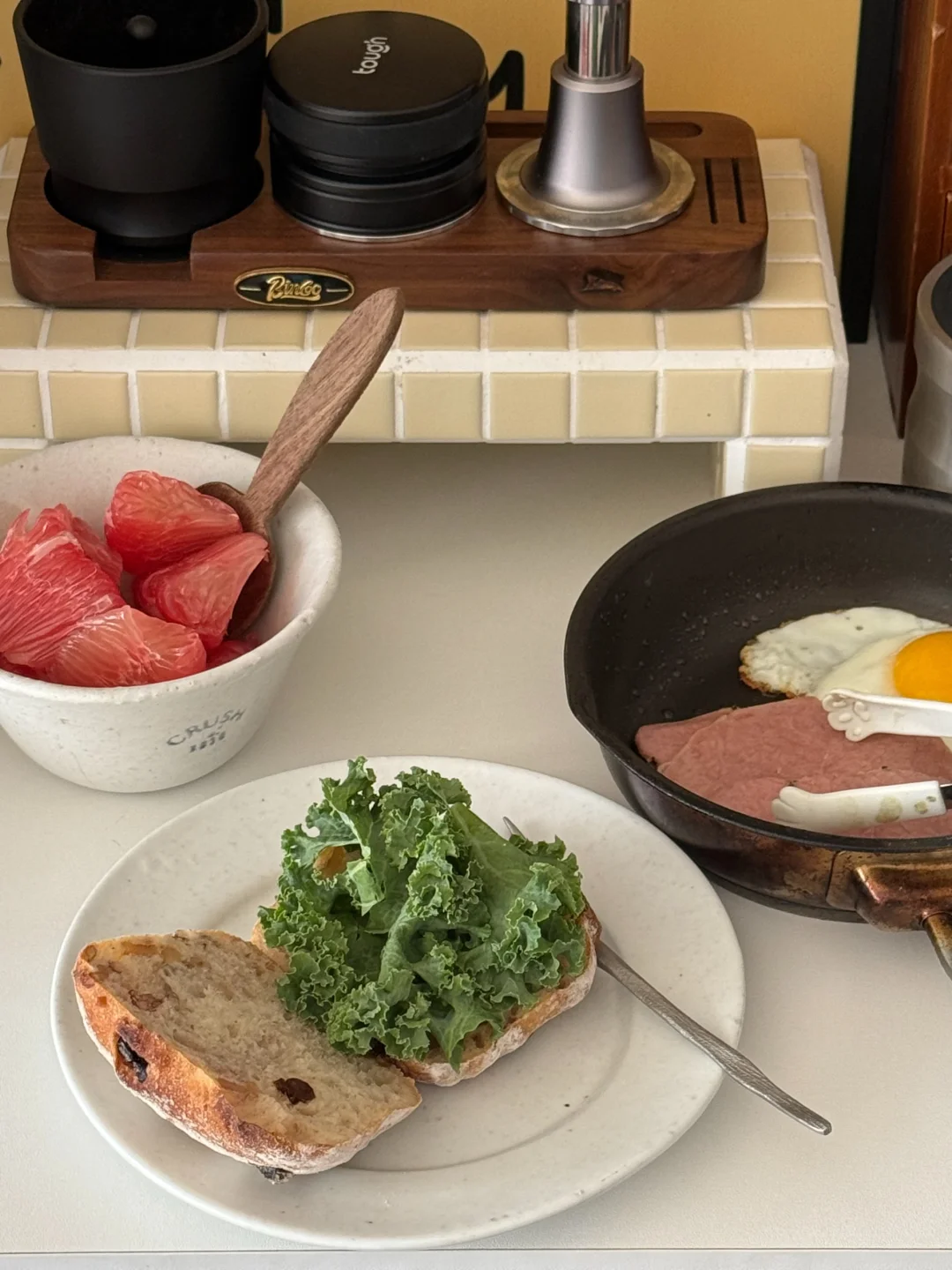 羽衣甘蓝也没有那么难吃嘛[赞R] 甚至比苦菊芝麻菜要好吃那么一点点🤏 - 羽衣甘蓝就撒了一点点黑胡椒海盐调味🧂 放了 芝士片🧀溏心煎蛋🍳帕斯雀牛肉片🥩 - 👌今天的早餐也是很满足