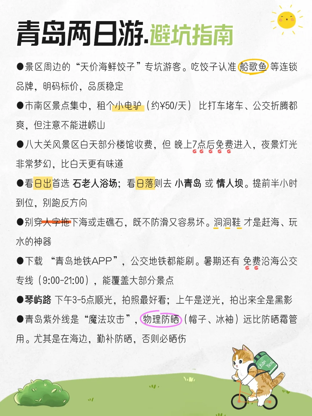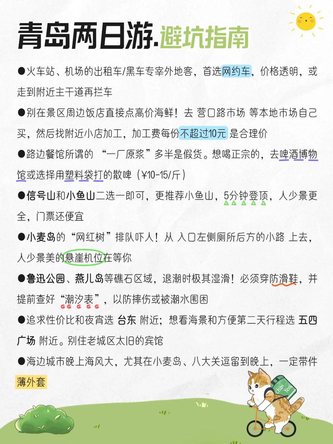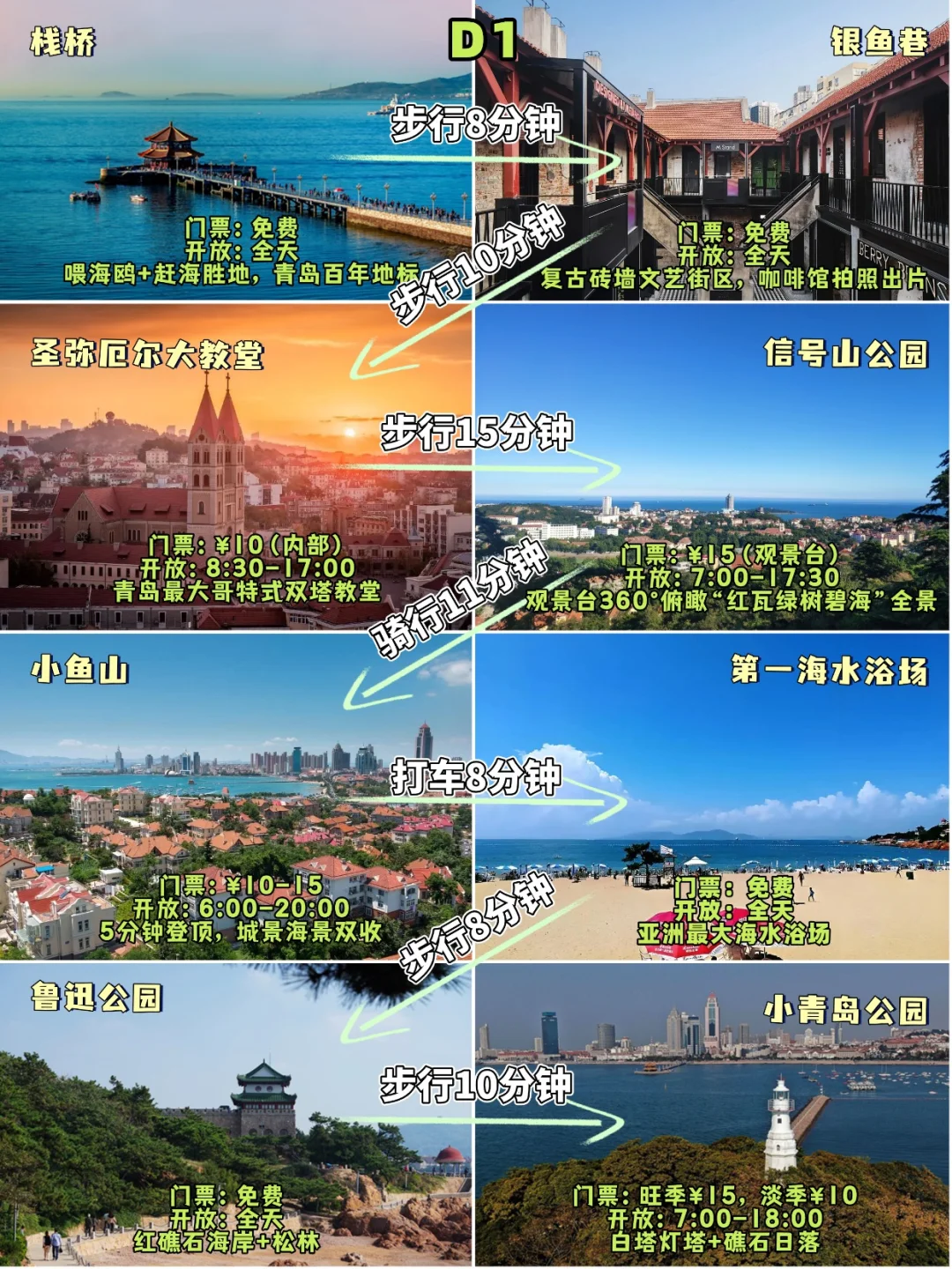 栈桥(7点人少鸥多)→ 银鱼巷(Honey Future咖啡必拍)→ 圣弥厄尔大教堂→ 小鱼山(5分钟登顶看城海双景)→ 鲁迅公园→ 琴屿路(15-17点顺光超出片)→ 小青岛(¥5看白塔日落)→ 台东夜市(野馄饨+袋装啤酒)