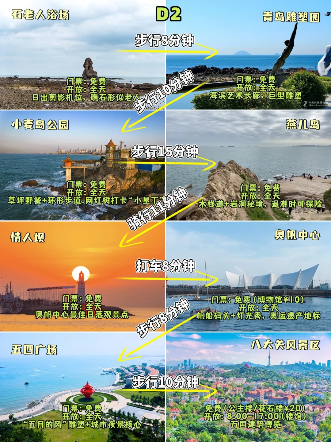 石老人浴场(定位"花神书咖"拍日出)→ 小麦岛(9点前到!走厕所后小路)→ 燕儿岛(退潮时岩洞秘境)→ 情人坝→ 奥帆中心→ 五四广场→ 八大关(19点后免费!夜游超梦幻)