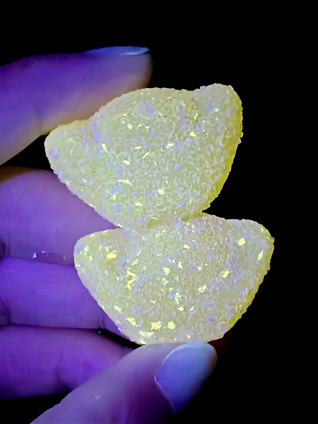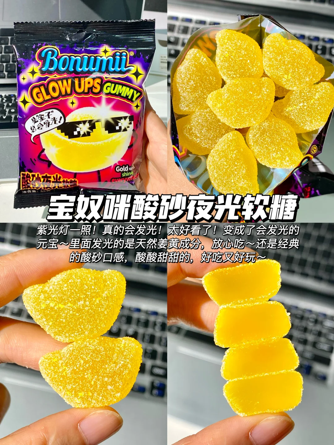 真的惊到我了!夜光软糖名不虚传!紫光灯一照!真的会发光!太好看了!变成了会发光的元宝~里面发光的是天然姜黄成分,放心吃~还是经典的酸砂口感,酸酸甜甜的,好吃又好玩,感觉好运财运都快快来了hh 给力!