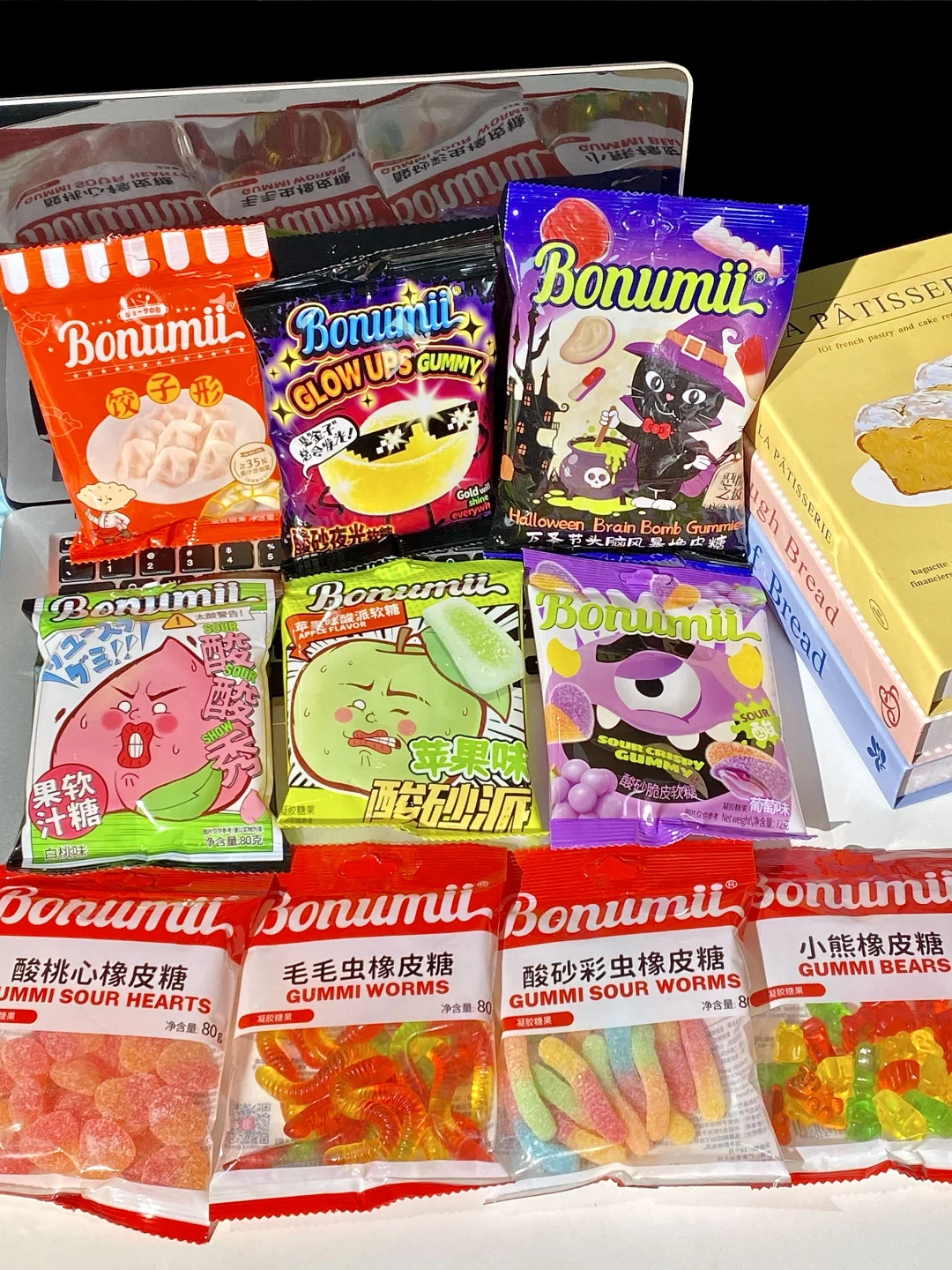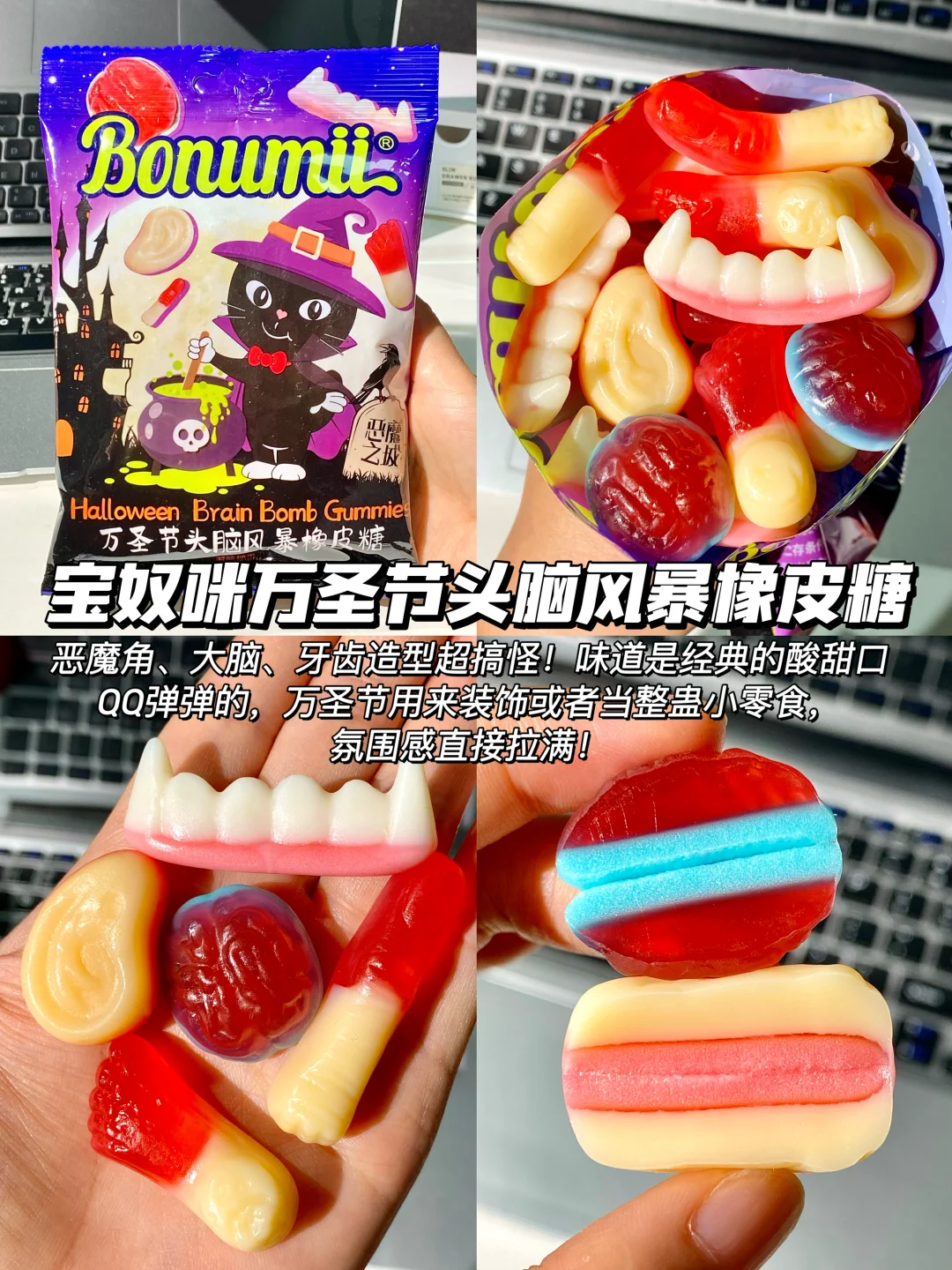 恶魔角、大脑、牙齿造型超搞怪!味道是经典的酸甜口,QQ弹弹的,万圣节用来装饰或者当整蛊小零食,氛围感直接拉满!