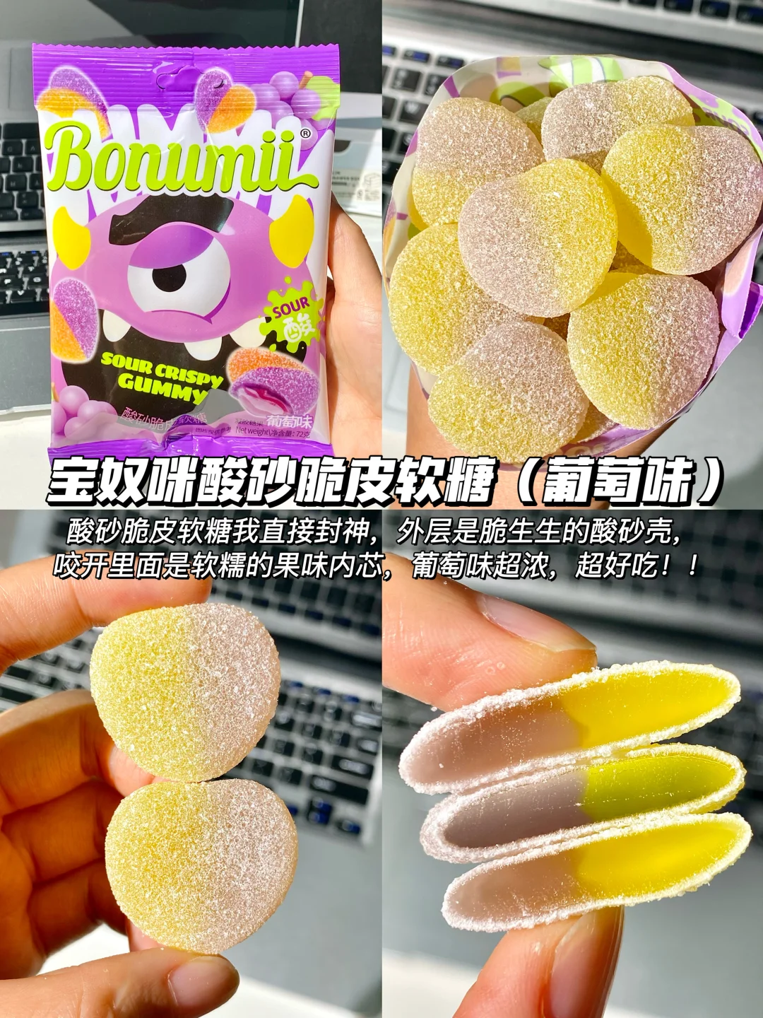 酸砂脆皮软糖我直接封神,外层是脆生生的酸砂壳,咬开里面是软糯的果味内芯,葡萄味超浓,超好吃!!