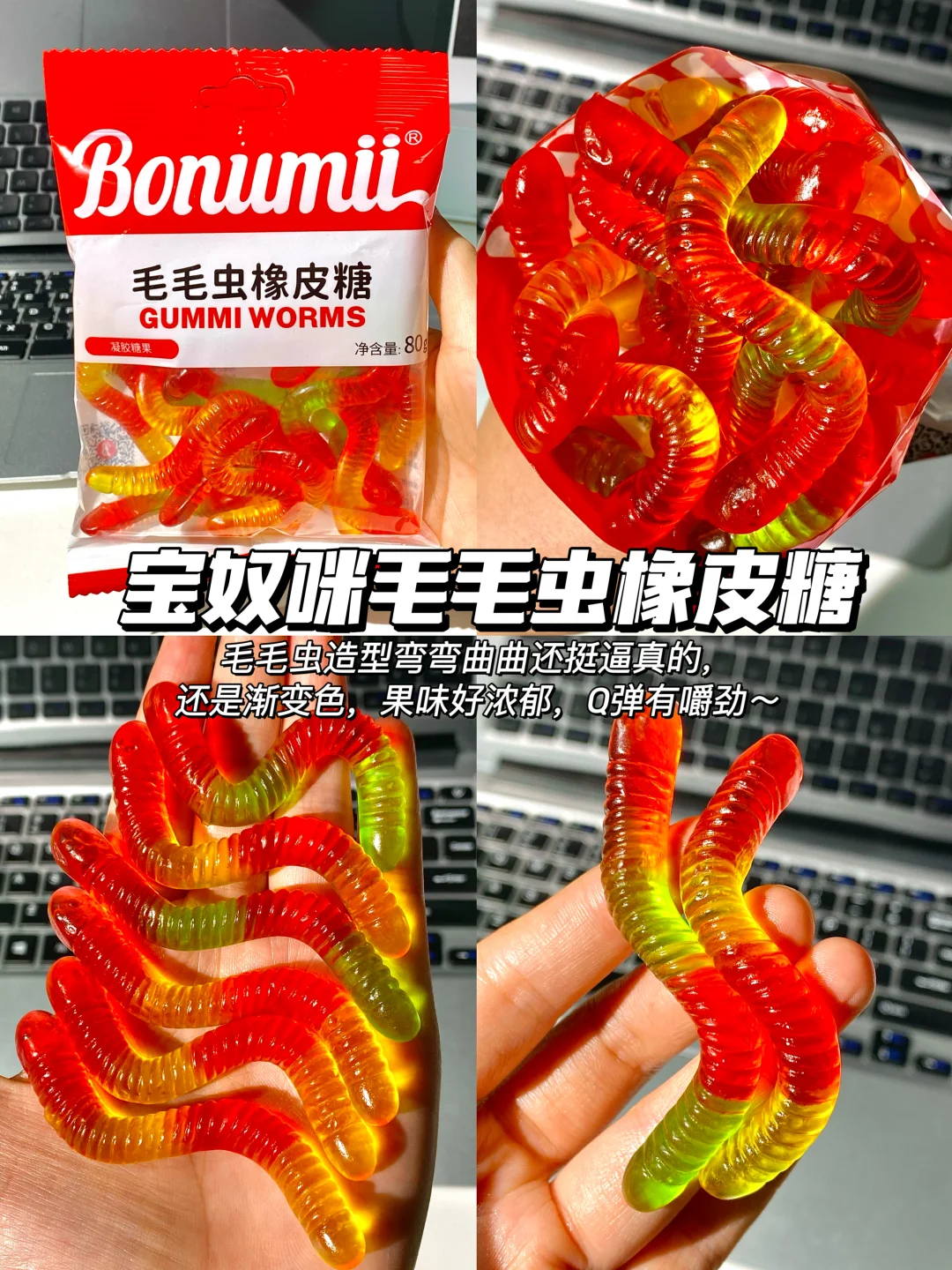毛毛虫造型弯弯曲曲还挺逼真的,还是渐变色,果味好浓郁,Q弹有嚼劲~