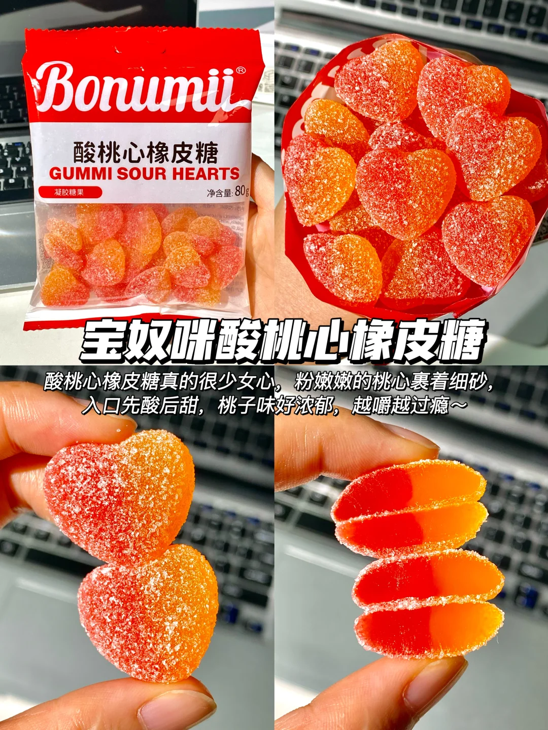 酸桃心橡皮糖真的很少女心,粉嫩嫩的桃心裹着细砂,入口先酸后甜,桃子味好浓郁,越嚼越过瘾~