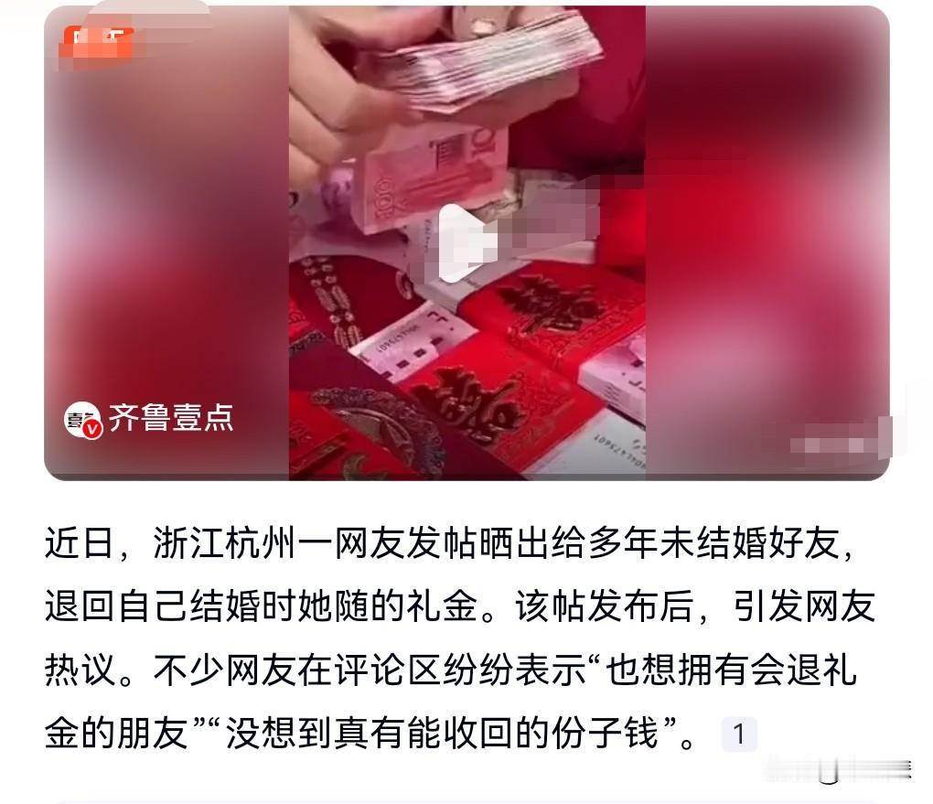 这绝对是个讲究人啊。 近日,女子结婚10年后主动退好友千元礼金。 由于女子的这个好朋友没有结婚的打算,所以她退还了当初好朋友给的1000元礼金。 这女子是个好人啊,值得交往。 女子都结婚十年了,她的好朋友还没有结婚的打算。 看来很多人都是晚婚晚育啊,甚至不婚了。 这可不太妙啊。