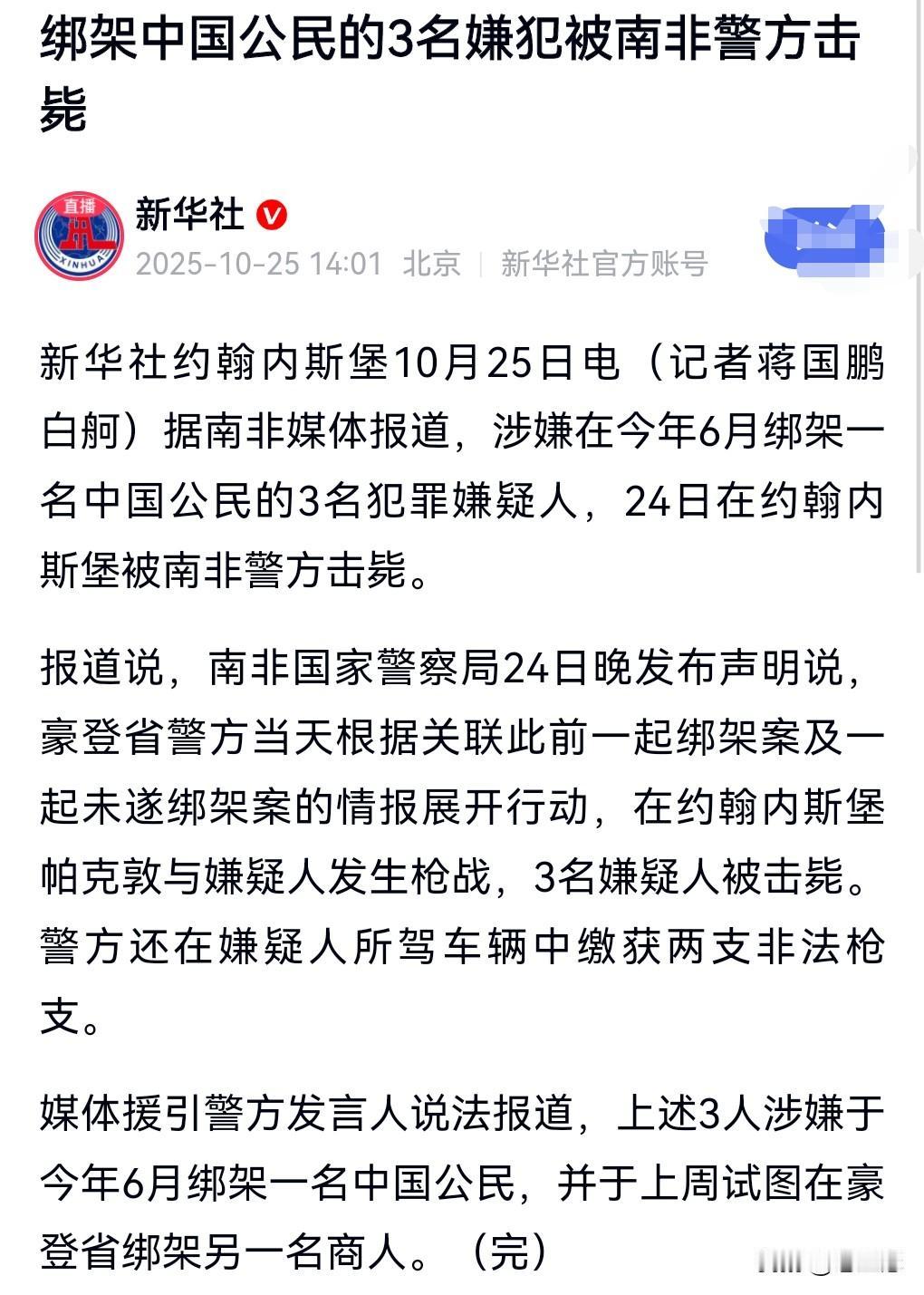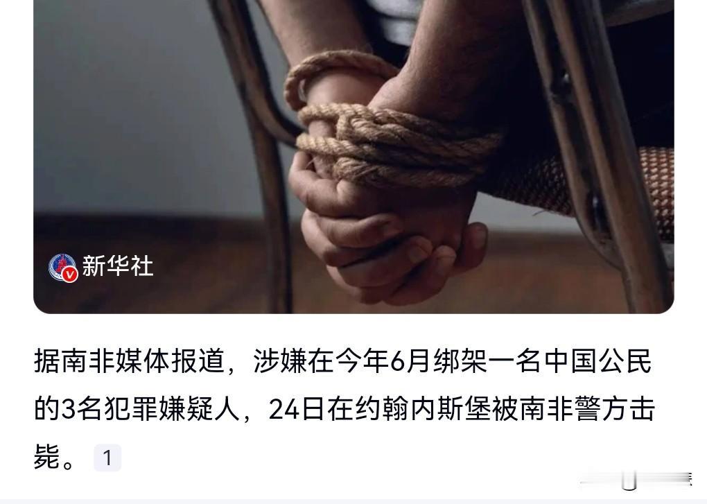 这真是大快人心啊。 10月25日在网上看到这么一件事情。 绑架中国公民的三名绑匪在24日被击毙。 确实该被击毙,这样的人专门做坏事的。 犯罪分子是专门来绑架有钱人的。 想不到南非的治安还是这么的差劲。 我国以前的治安也很差,经常发生绑架案,现在好太多了。 我国应该是世界上最安全的国家之一了。