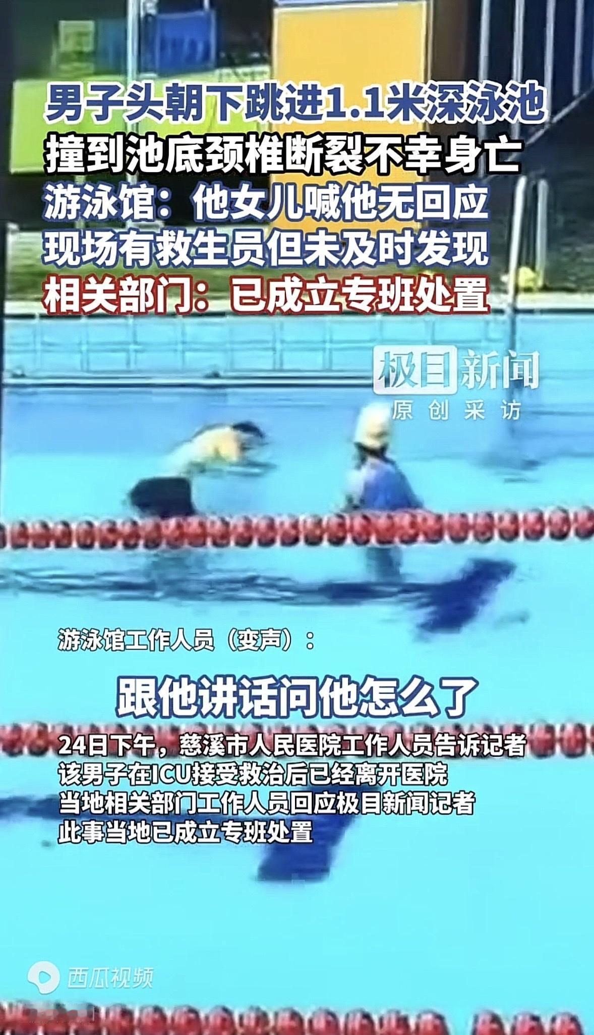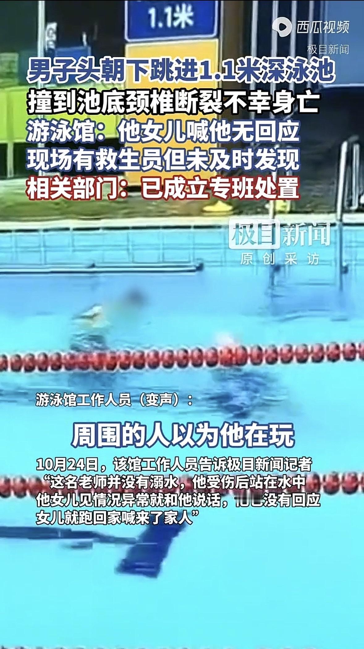 浙江宁波,36岁体育老师在游泳馆教7岁女儿学习跳水,期间,他以跳水姿势一头扎进1.1米的浅水区,结果脑袋磕在池底,后颈椎断裂了,女儿看爸爸漂浮半天没反应,在出事的16分钟里,也没有救生员出现,女儿只好跑回家喊妈妈过来,可惜男子还是去世了,事后负责人表示,当时救生员看到了,但以为是父女俩在闹着玩,就没管,况且水下憋气5、6分也很正常!这个说法让家属接受不了。 2023年10月18号,36岁的小学体育老师胡某带着7岁女儿来游泳馆锻炼。他是这里的常客,已经坚持锻炼了好几年。 当天下午5点左右,他像往常一样带着女儿来到浅水区。监控显示,当时胡某站在池边,双手扶着女儿教她跳水姿势。 就在女儿刚刚学会基本动作时,胡某自己突然头朝下,以跳水的姿势扎进了水深才1.1米的浅水区。 当时,胡某跳下后整个人呈倒立状,后脑勺重重磕在池底。 监控画面显示,他的身体瞬间僵直,随后开始在水面漂浮。 更让人揪心的是,年仅7岁的女儿还以为是爸爸在和她玩闹,一个劲想把沉下去的爸爸拉起来。 孩子太小,根本不懂发生了什么,只能使出全身力气想把爸爸扶起来,可怎么也拉不动。 在长达16分钟的时间里,小女孩一直守在爸爸身边,直到最后实在支撑不住才哭着跑回家喊妈妈。 当胡某的妻子和游泳馆工作人员赶到现场时,救护车也同时到达,并将胡某送往医院,但此时他的颈椎已经严重断裂。 据胡某的姐姐邹女士透露,医生在ICU抢救了4、5天,可由于弟弟颈椎损伤过重,家属不得不放弃治疗。 虽然出院小结上写着"溺亡",但弟弟肺部没有水,根本不是溺亡。 事后,馆方负责人张经理表示,浅水区本就不允许跳水,馆内多处都设有醒目标识。 他特别强调,事发时处于晚饭期间,但馆里有3名救生员。 那为什么没有救生员施救呢? 张经理解释说,当时很多客人看到小女孩在爸爸身边,都以为他们在玩水嬉戏。水性好的人憋气5、6分钟很正常,所以一开始没人意识到危险。 但邹女士对这种说法坚决反对。 她认为,如果救生员第一时间发现异常,弟弟可能还有救。 她情绪激动地表示,从胡某跳水到女儿跑回家,整整16分钟没有救生员主动干预,这是游泳馆不可推卸的责任。 目前,当地相关部门已经介入调查此事。 游泳馆负责人表示,已经上交了所有监控录像和救生员值班记录,如果调查出来这件事他们确实有过失,那他们绝不会推卸责任。 有游泳爱好者认为,1.1米的水深对于成人跳水确实存在非常危险,即使水性再好,头部先着水也可能受重伤。 风险自担吧,浅水区不能跳水是常识,这名体育老师犯了低级错误,应该为自己的行为买单。 也许游泳馆有些许责任,但脊椎断裂你不死也是瘫痪那种,体育老师还敢浅水区跳水,这真不知道怎么想的。 但也有人认为,游泳馆有主要责任,既然浅水区不能跳水,为什么在岗的3名安全员没有及时制止?说明要么当时馆里就没有人看着,要么就是压根没好好盯着,而是在玩手机打发时间。 游泳馆肯定难辞其咎,这么长时间没有救生员施救,是有责任的,但不是100%责任,以及赔偿多少,那还要看具体情况和相关证据,如果死亡原因为溺亡,那就是游泳馆100%责任。 那么,从法律角度来看,游泳馆到底有没有责任? 《民法典》第1198条规定:经营场所、公共场所的经营者、管理者或者群众性活动的组织者,未尽到安全保障义务,造成他人损害的,应当承担侵权责任。 游泳馆作为公共体育场馆的经营者,对胡老师的死亡后果可能涉及未尽安全保障义务的侵权责任认定。 游泳馆作为经营场所管理者,需履行"合理限度内的安全保障义务"。 这包括硬件设施的安全标准,如浅水区1.1米水深应设置醒目"禁止跳水"标识、人员配置、应急响应机制,如监控系统覆盖范围、救生员巡查频率等等… 游泳馆负责人提出"误以为父女嬉戏"的辩解,需从“救生员是否经过专业培训以区分正常嬉水与溺水征兆”这方面审查。 根据《游泳救生员国家职业标准》,救生员需掌握"观察、判断、施救"的完整技能链,包括识别溺水者"静止漂浮、手臂拍打水面无力"等异常状态。 胡老师跳水后呈"倒立僵直"状态,已经明显超出正常嬉水范畴,救生员没有及时识别构成"注意义务的违反"。 胡某的直接死因是颈椎断裂导致的呼吸衰竭,属于自身跳水行为引发的初始风险。但根据"危险控制理论",游泳馆作为专业场所管理者,对潜在危险具有更强的控制能力。 案件中,16分钟内的施救延迟与最终死亡结果存在法律上的因果关系。 对此,你怎么看? 关注@运良说法. 学法律知识不迷路