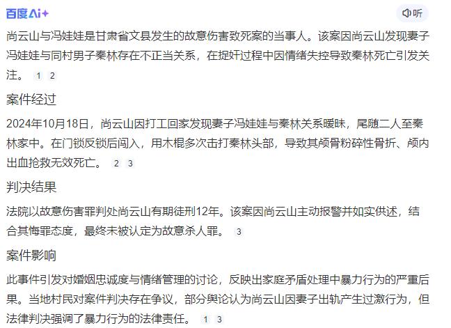 别人的老婆碰不得!甘肃,男子打工回家时,看见妻子同村男子一起进到对方家中,便跟随其后将门锁上进行捉奸!结果因为下手太重,棍棒多次击中对方头部,导致其经抢救无效死亡,法院这样判! 事情发生的前夜,尚云山满怀期待地踏上了回乡的路,作为一名长期在外打工的农民工,“家”这个字对于他来说,更多的是一种遥不可及的幻想。 在外面打工的时候,他和家人已经长时间没有打电话,唯一支撑着他继续努力的动力,就是对家的渴望。 他想象着妻子冯娃娃温柔的笑容,想象着儿子在家门口的欢声笑语,村里的春联已经贴上了,他能感受到年味儿的浓郁,这让他觉得一切的辛苦都值得。 当他回到村子,现实给了他一个沉重的打击,尚云山看见秦林和冯娃娃并肩走进了秦林的家,这一刻,他所有团圆的美好幻想瞬间崩塌,心中积压已久的愤怒和屈辱爆发了。 他开始失去理智,最初他并没有立即想杀人,他找来一根木棒和一些绳子,准备悄悄地把秦林家的门锁住,他的计划是想“捉奸在床”,给这对男女一个羞辱,让他们在村里再也抬不起头。 但他站在秦林家门外听到屋里的动静时,他的愤怒达到了顶点,所有的压抑、屈辱和背叛的情感在这一刻找到了出口。 尚云山再也忍不住,他猛地撞开门,冲进屋里,举起木棒狠狠砸向秦林的头部,一次,又一次,直到秦林倒在地上不再动弹,屋内成了血腥的战场。 尚云山的心里,那个象征着团圆和温暖的“家”,在一瞬间化为一片废墟。 事后,尚云山陷入了深深的懊悔和自责,他主动向村干部坦白,在他们的劝说下,他选择自首,为他争取到了从轻处罚。 这个判决,虽然在法律上给出了一个明确的结论,但对尚云山来说,他的一生已经完全毁掉了。 在监狱里,尚云山夜夜无法入睡,孤独和内疚吞噬着他,他常常反思自己当初的冲动和错误,觉得自己已经再也无法回到过去那个家庭。 但外面的世界依然没有改变,冯娃娃哭倒在地,她独自面对着破碎的家庭和未来的迷茫,她的心情比尚云山更复杂,她不仅失去了丈夫,也失去了自己的生活支柱。 村里的人们对这件事有不同的看法,有些人认为尚云山活该,罪有应得;而另一些人则对他的遭遇表示同情,觉得他也是一个受害者,过于沉重的压力让他做出了错的决定。 要知道,长期外出务工的农民工,家庭的情感交流本来就非常匮乏,丈夫和妻子之间的沟通几乎为零,留守的家庭空虚且脆弱。 没有有效的情感疏导和矛盾调解机制,许多人的内心早已变得孤独和脆弱,如果当初有更多的支持和帮助,或许这场悲剧就能避免。