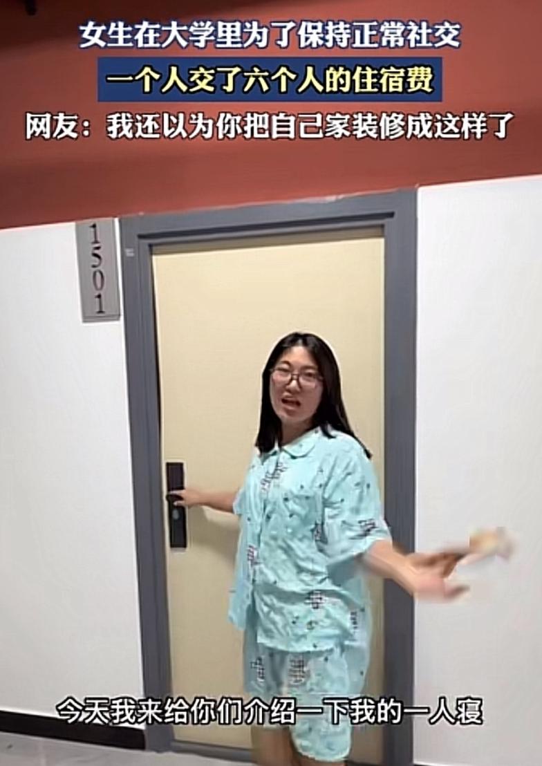 等于一千五租个单间, 我觉得这个女学生挺聪明,比在外面租房子或公寓楼合算,也更安全和方便, 女大学生想住得自在,竟然一个人交了六个人的住宿费,把整个宿舍包了下来。 她说学校宿舍每个人 3000 块,刚好有多余的宿舍,就申请到了。 我觉得真挺好的,大学生成人了,只要合校规,在市场经济下无可厚非,个人也可以去校外住宿。 学校没有硬性规定,纯属个人自由,大学不是义务教育,不能指望学校面面俱到管理。