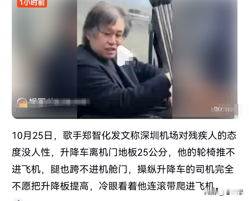 今时今日这样的服务态度肯定是不行的。 作为一个机场,无论是管理者还是员工,都应该友善的对待顾客。 10月25日,郑智化发文控诉深圳机场。 说深圳机场对残疾人是最没人性的。 这也怪不得郑智化发火,有些细节确实太不到位了。 特别是操纵这个升降机的司机也不愿意把升降板抬高。 看着郑智化连滚带爬的上飞机。 这真是相当的可恶。 这样的司机不炒,难道留着过年吗?