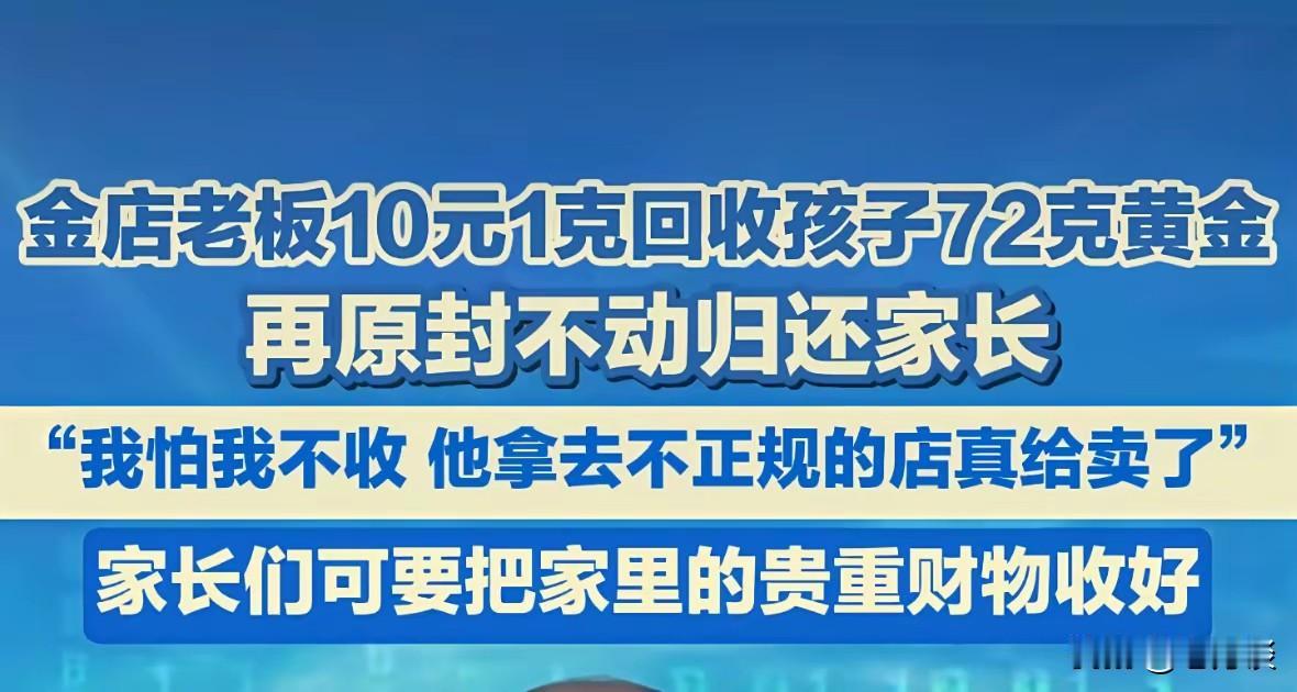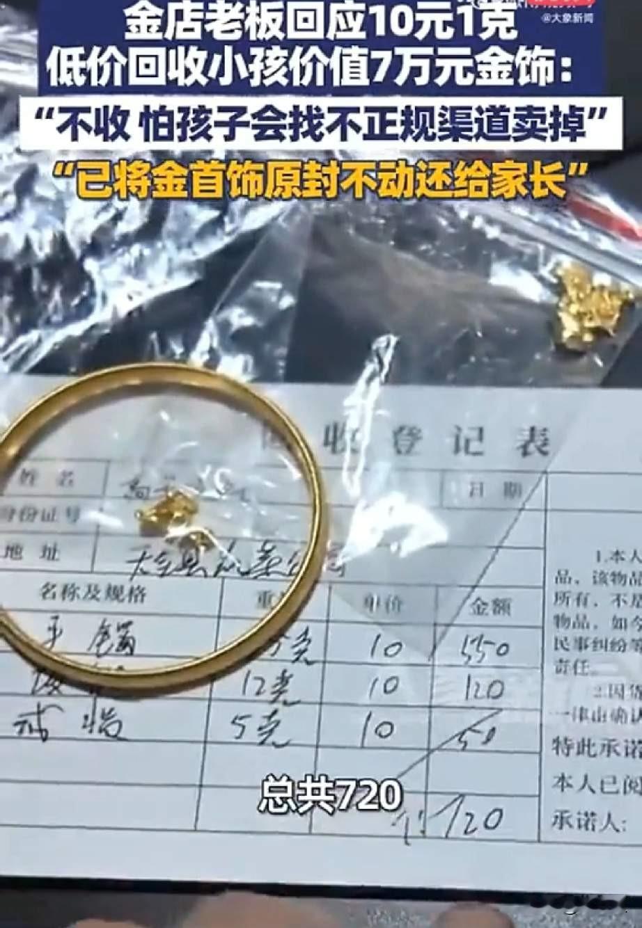 怒赞四川雅安金店老板高先生,做人实在太正了,他没有趁火打劫。小孩拿着72g黄金到高先生经营的金店换钱,高先生以每克10块钱的价格收了这批金首饰但是高先生并没有把这些金首饰占为己有,而是通过各种方式,找到小孩的家长,把72g黄金原封不动还给了家长,只收取了象征性的720元保管费。高先生认为,如果自己不收这些金首饰,小孩子肯定会到其他店里去贩卖。一旦这些金首饰被用心不良的人收走了,家长想要收回这些黄金,那是完全不可能的事情而这些黄金价值7万多元,对于一般家庭而言,也是一笔非常大的费用。对于家长而言,这给家长提了一个醒,一定要把家里贵重的物品收藏好,否则真的可能被家里的熊孩子拿出去换钱用了。 对于高先生的行为,真的值得点赞,他没有以大欺小,也没有趁火打劫,而是替家长保管了这些黄金,现在如此讲良心、讲公道的商家真不多,这种见了巨额财产不心动的人不多,这家店铺货生意不火爆真是天理难容。这样有良心、有担当的店家,不可能卖假货、A户,在这里卖东西,主打一个放心。
