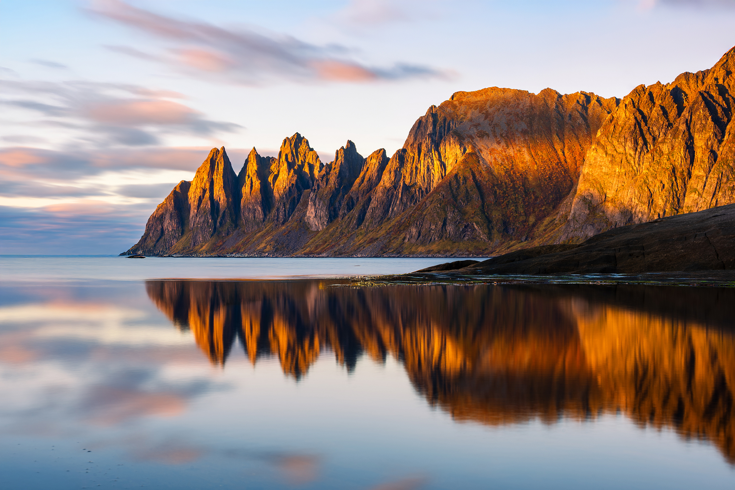 作为北极圈边缘的群岛,塞尼亚更像藏在北极圈的 “秘境”,野性未驯的峰峦与温柔如镜的海面相拥,把北欧山海的灵魂,写进每一道光影里。ISO50,F16,1/10秒,30张堆栈。