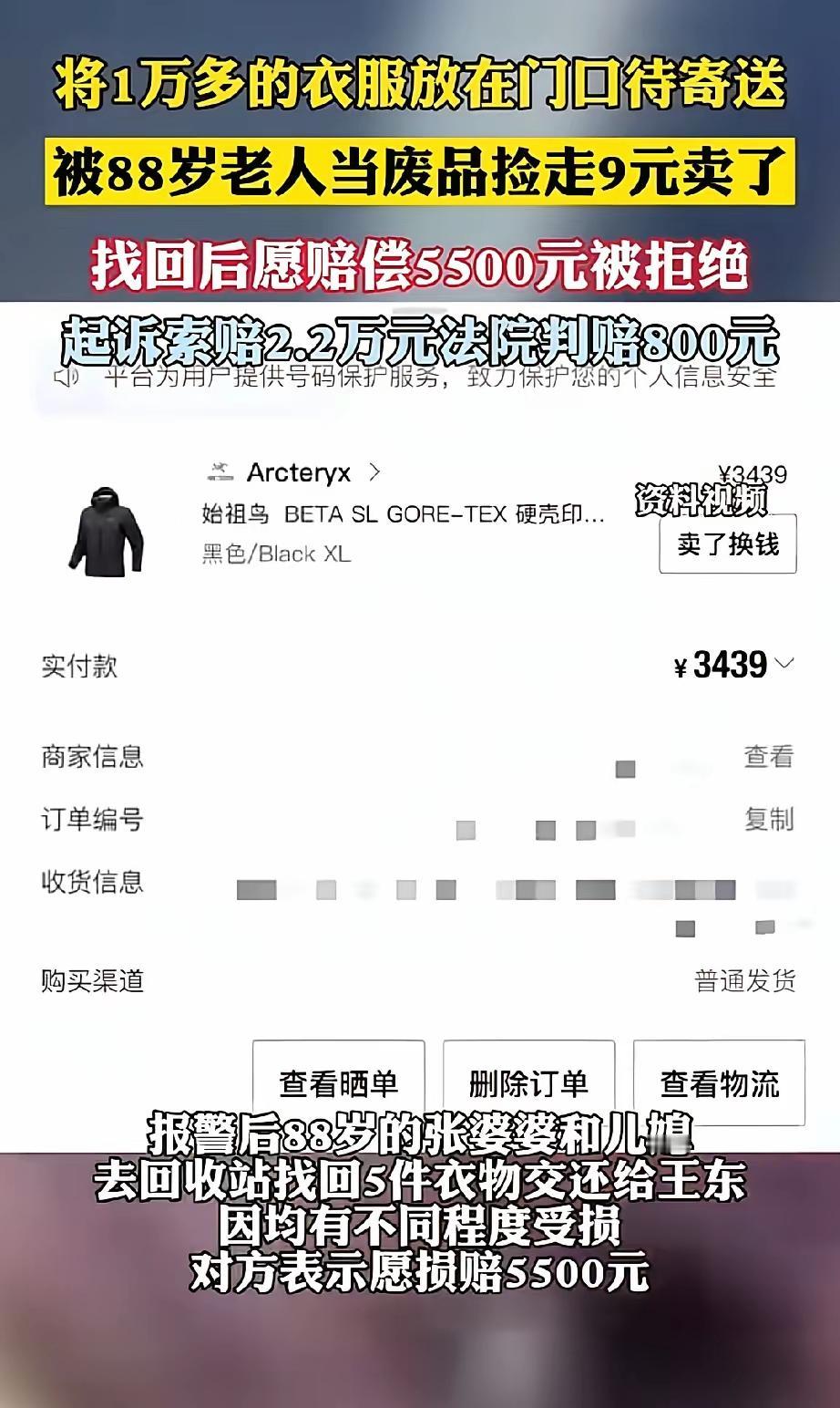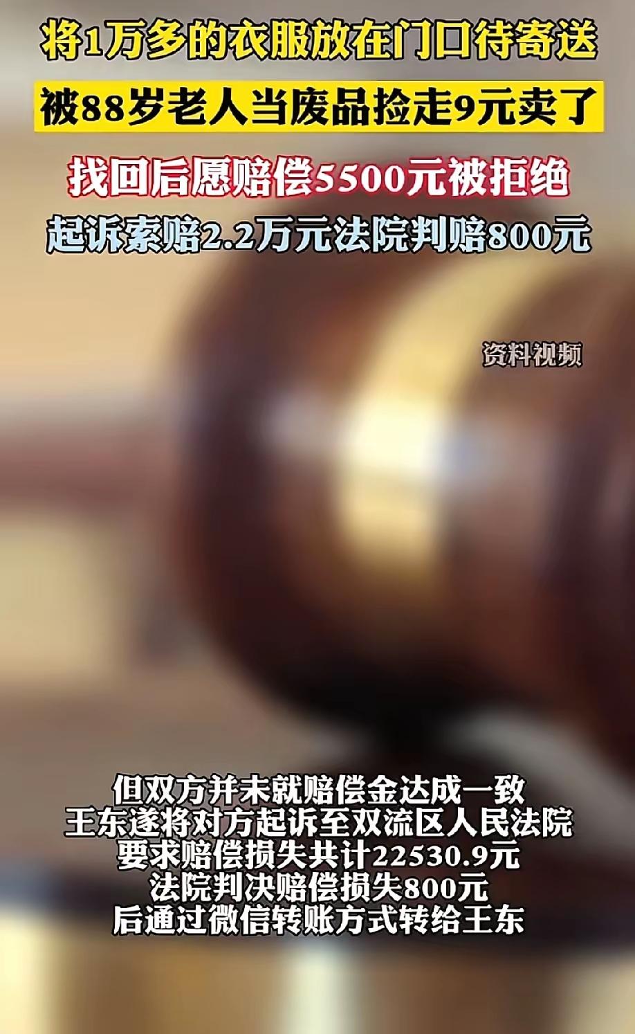 成都男子将价值一万多元的衣服打包好,放在门口等待快递员上门揽收,不料被邻居88岁的老奶奶当作废品捡走,随后以九元的价格卖给了收废品的人。 男子晒出衣服的购买记录,每件衣服价值都在2000元以上,五件衣服总价一万多,他要求老奶奶按原价赔偿。 老奶奶的儿女愿意赔偿给男子5500元。 最终,法院判决老奶奶赔偿男子800元,家属通过微信转账的方式支付了赔偿款。 网友评论: 十几年前我也失误过,把老公打包放在门口的几件的梦特娇T恤当成垃圾扔了,事后找一楼捡破烂的老太太要,她不承认,没过几天发现她儿子身上穿的我扔掉的衣服,没办法只能怪自己太粗心了。 我觉得法院肯定不会判错的,扔在门口的杂物,就是按垃圾处理的,不过人家门口的东西,真的不要去动,这很没礼貌的。 现在有个现象,绝大多数小区,包括中高端小区都有大量的老人四处收集纸箱和塑料瓶卖。而且我确定是本小区的人员。这是什么社会现象。 才赔800.估计是按衣服的实际损耗来赔的,这个男的损失大。关键是这个放家门外的东西,外人随意拿走会怎么定性?放在家门外的是不是就相当于是不要的废品?